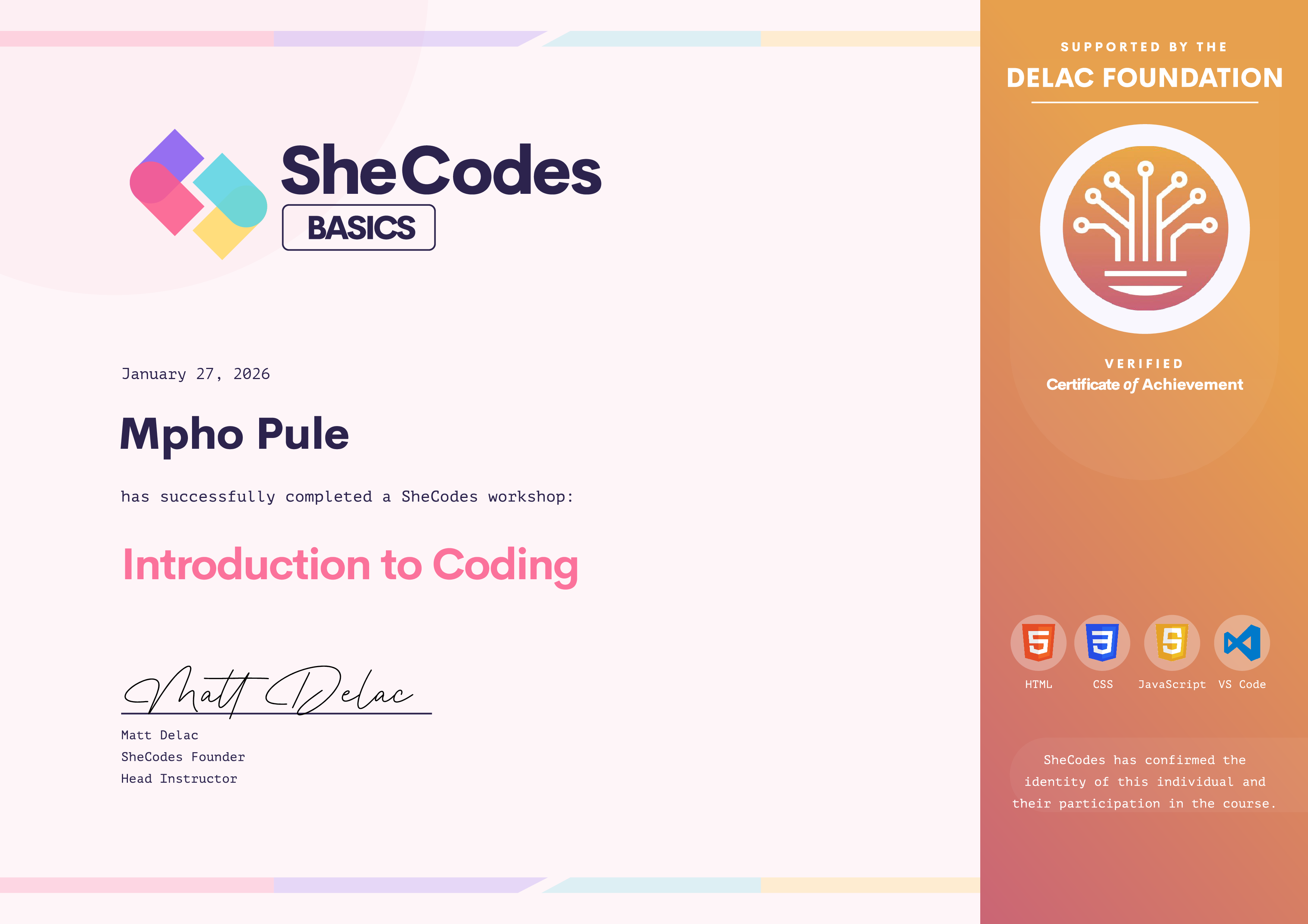 Mpho has been fully supported by the Delac Foundation to complete this SheCodes Workshop