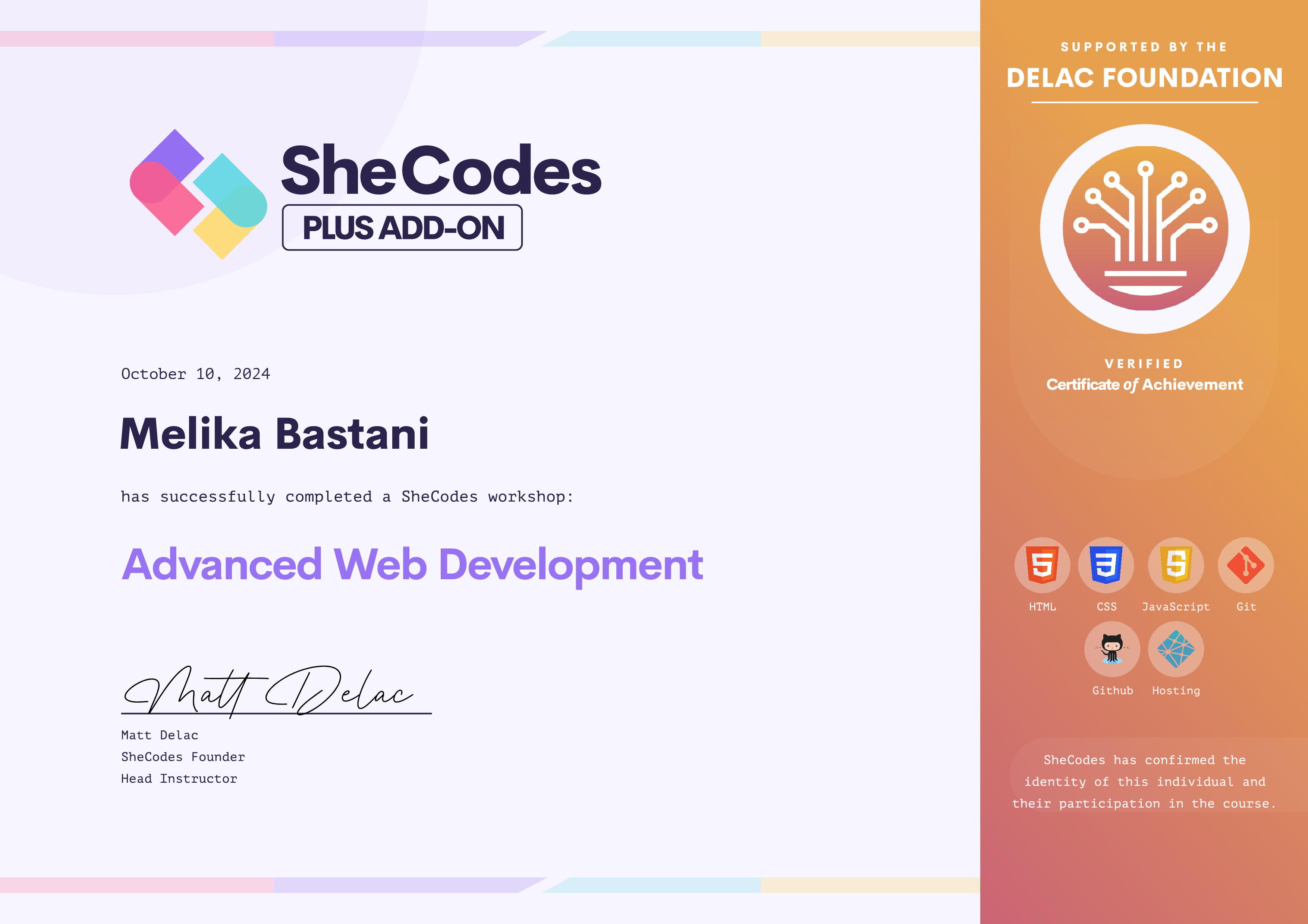 Melika has been fully supported by the Delac Foundation to complete this SheCodes Workshop