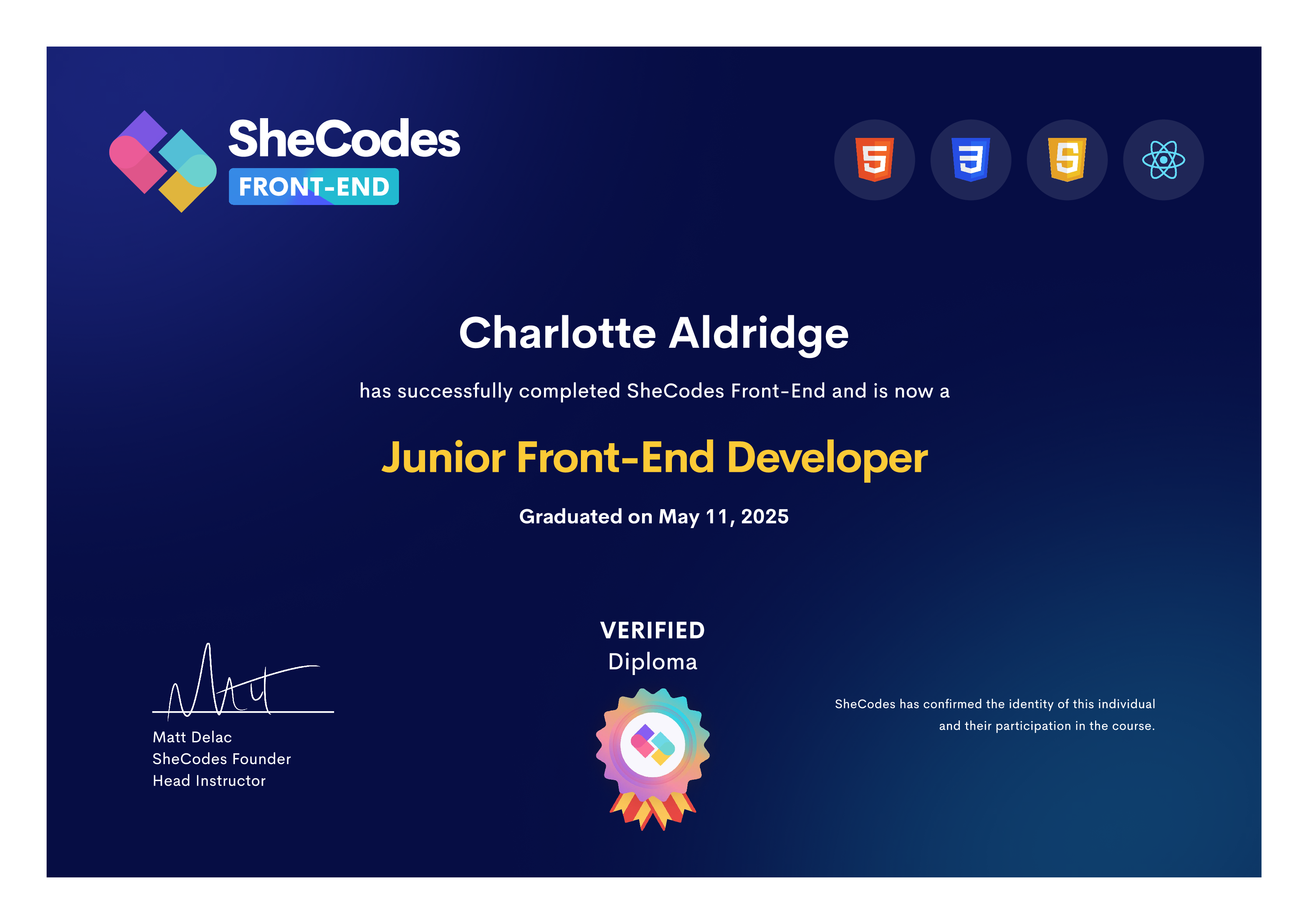 Charlotte successfully graduated from at least one SheCodes Coding Workshop and is featured in the SheCodes Hall of Fame
