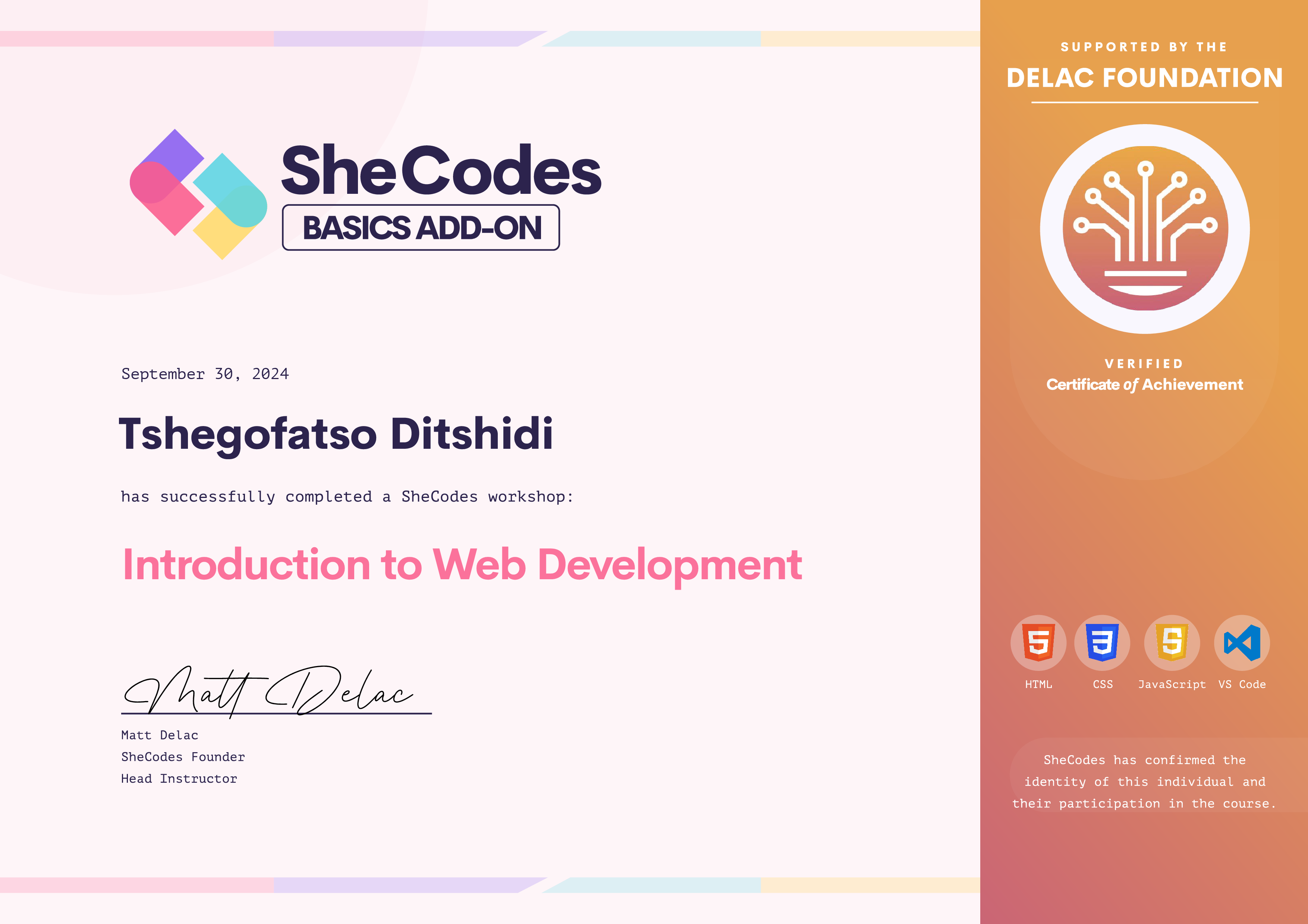 Tshegofatso has been fully supported by the Delac Foundation to complete this SheCodes Workshop