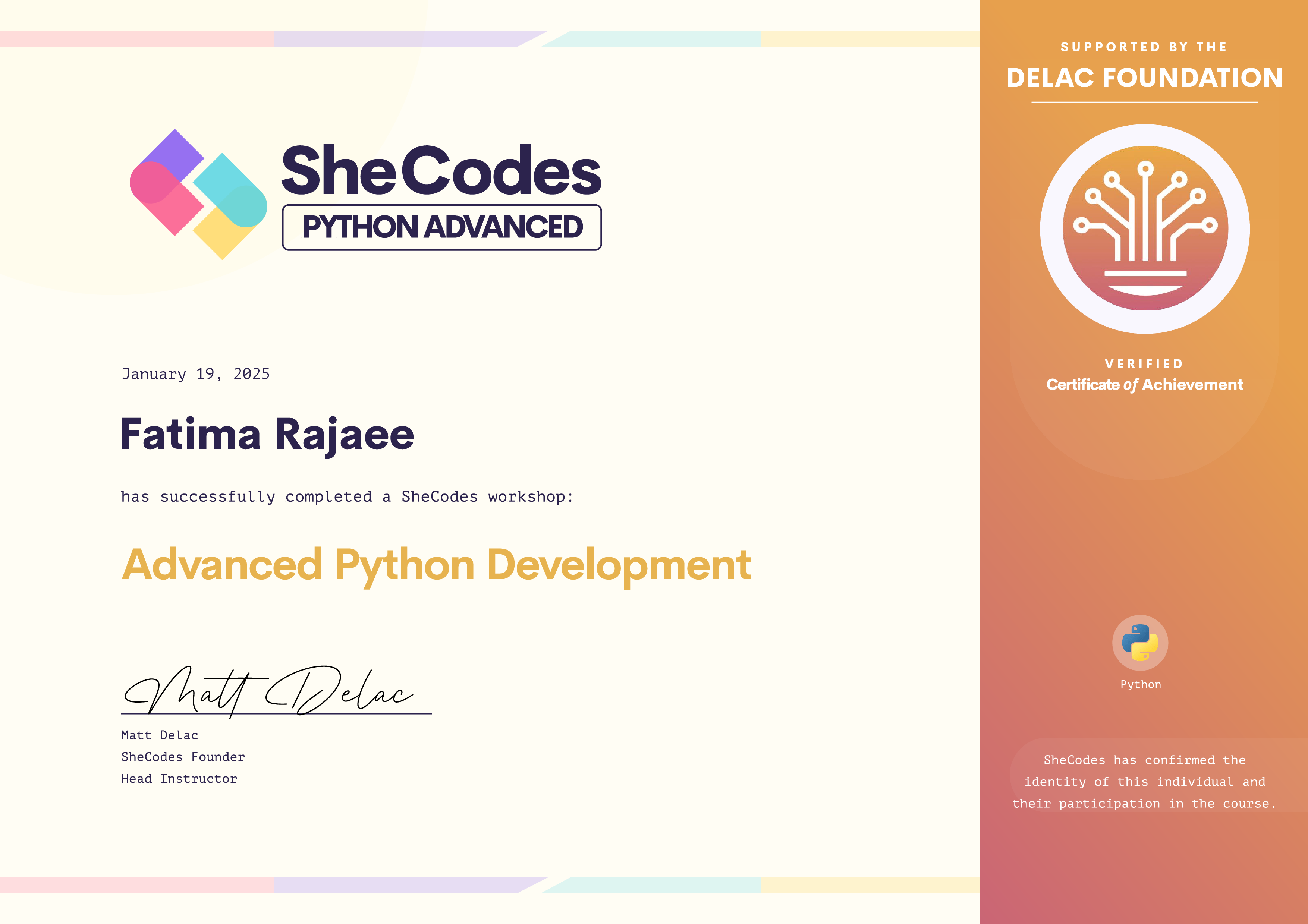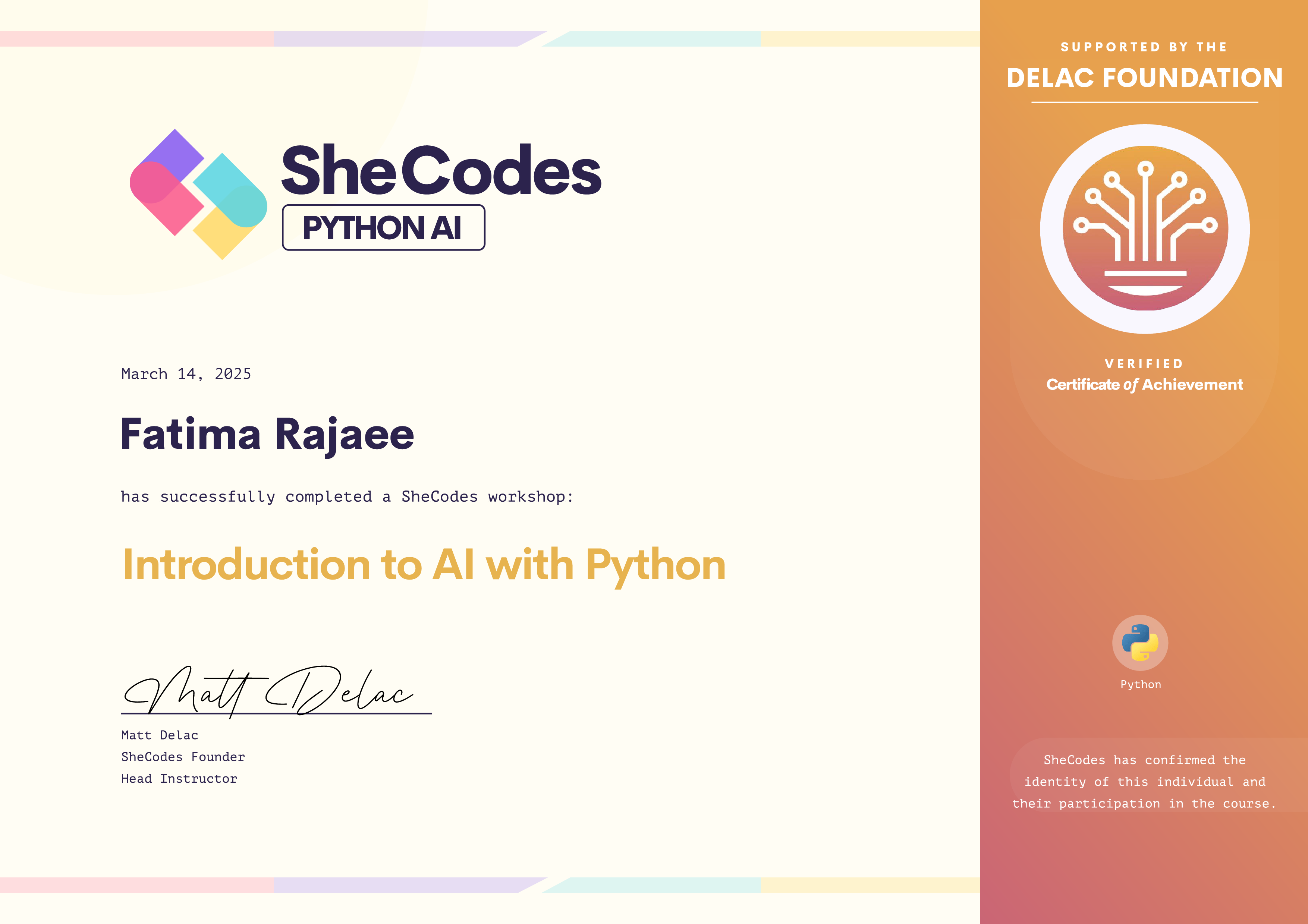 Fatima has been fully supported by the Delac Foundation to complete this SheCodes Workshop