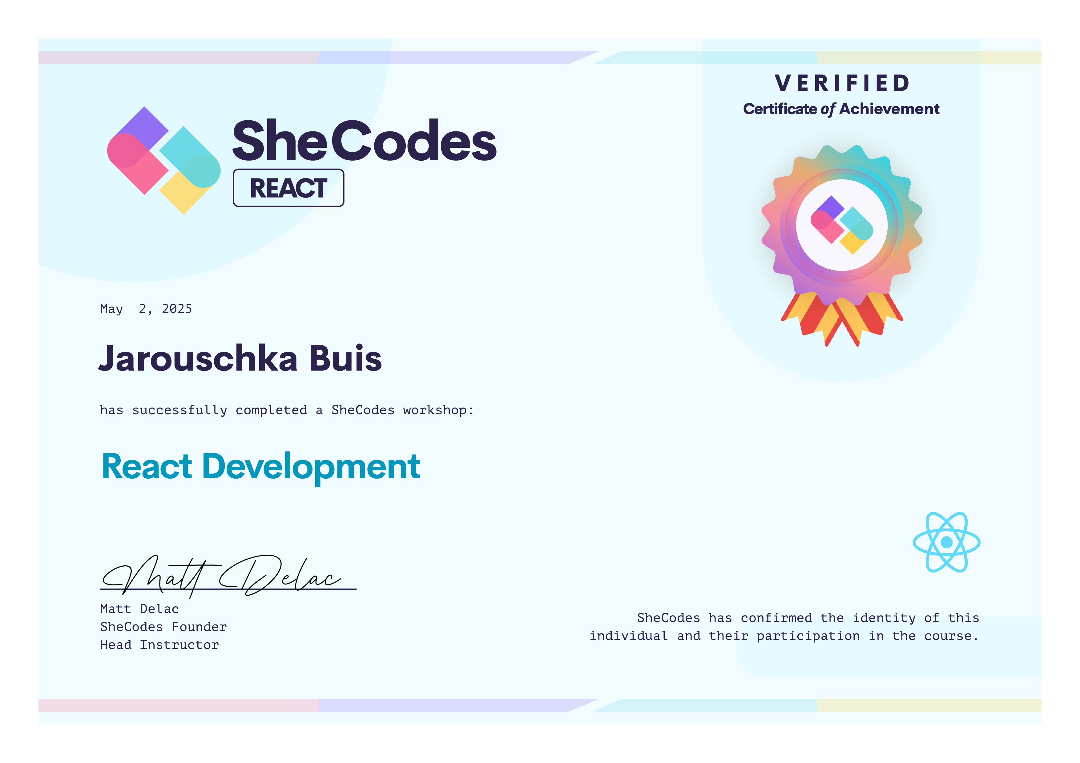 Jarouschka successfully graduated from at least one SheCodes Coding Workshop and is featured in the SheCodes Hall of Fame