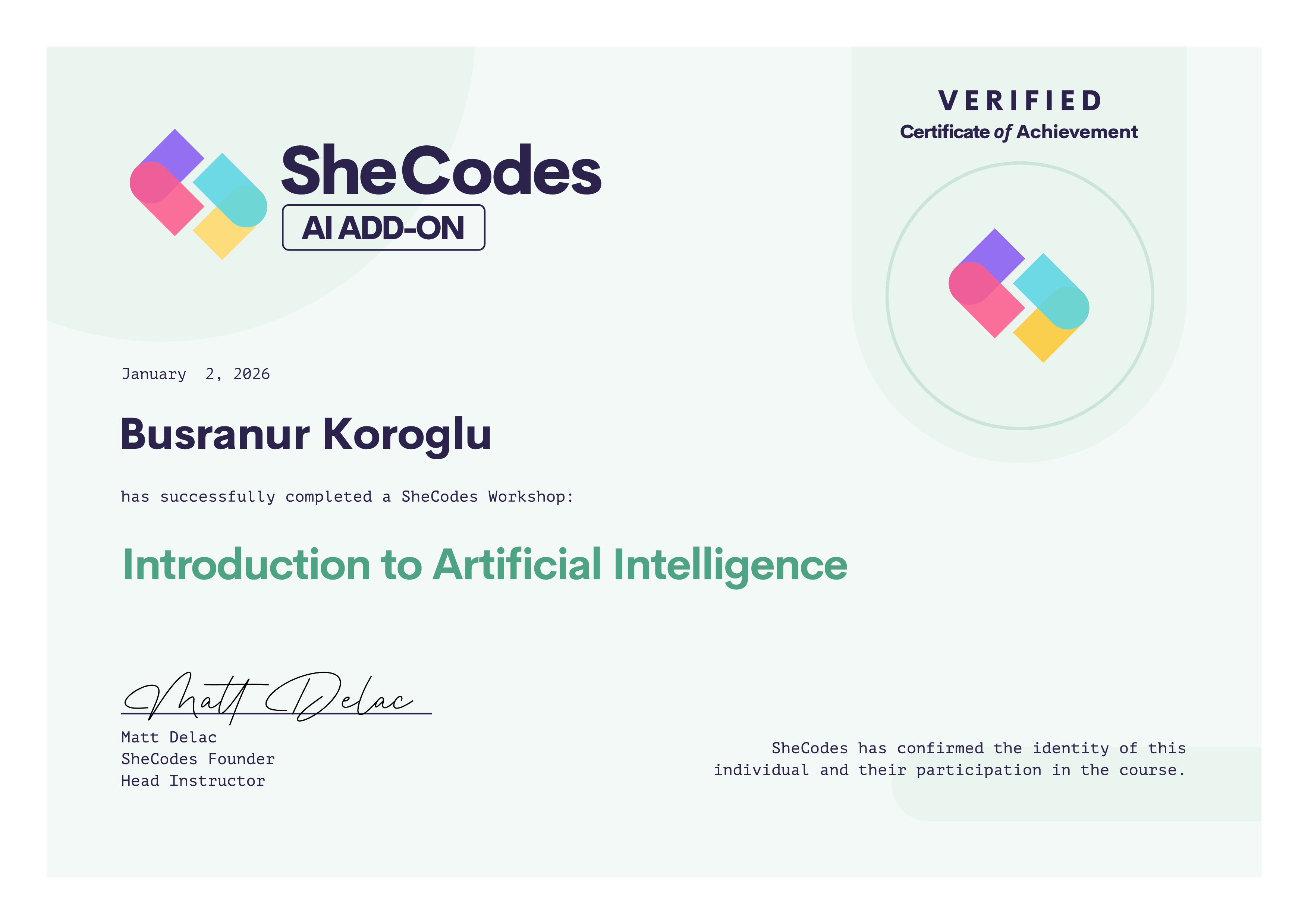 Busranur successfully graduated from at least one SheCodes Coding Workshop and is featured in the SheCodes Hall of Fame