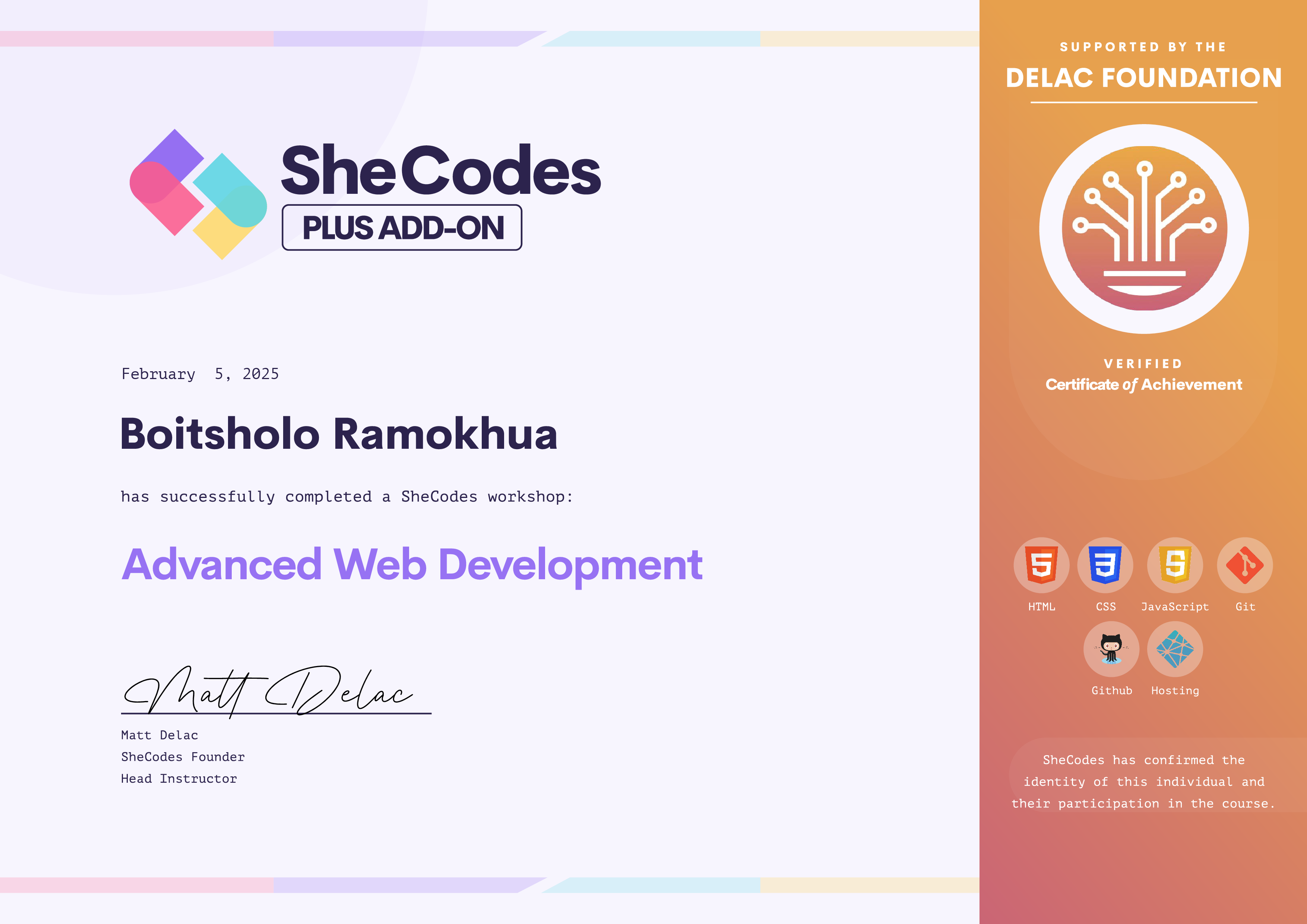 Boitsholo has been fully supported by the Delac Foundation to complete this SheCodes Workshop