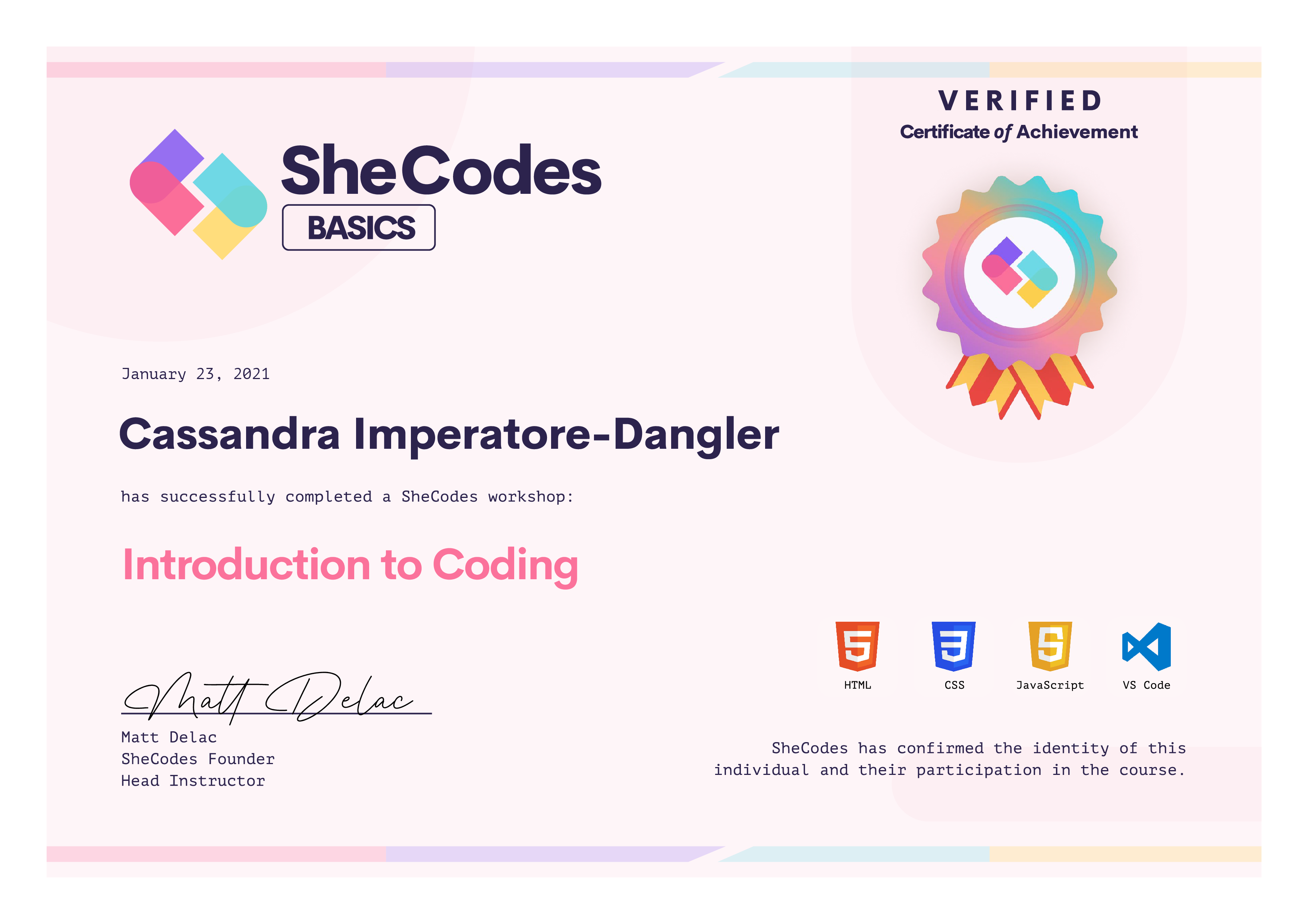 Cassandra successfully graduated from at least one SheCodes Coding Workshop and is featured in the SheCodes Hall of Fame