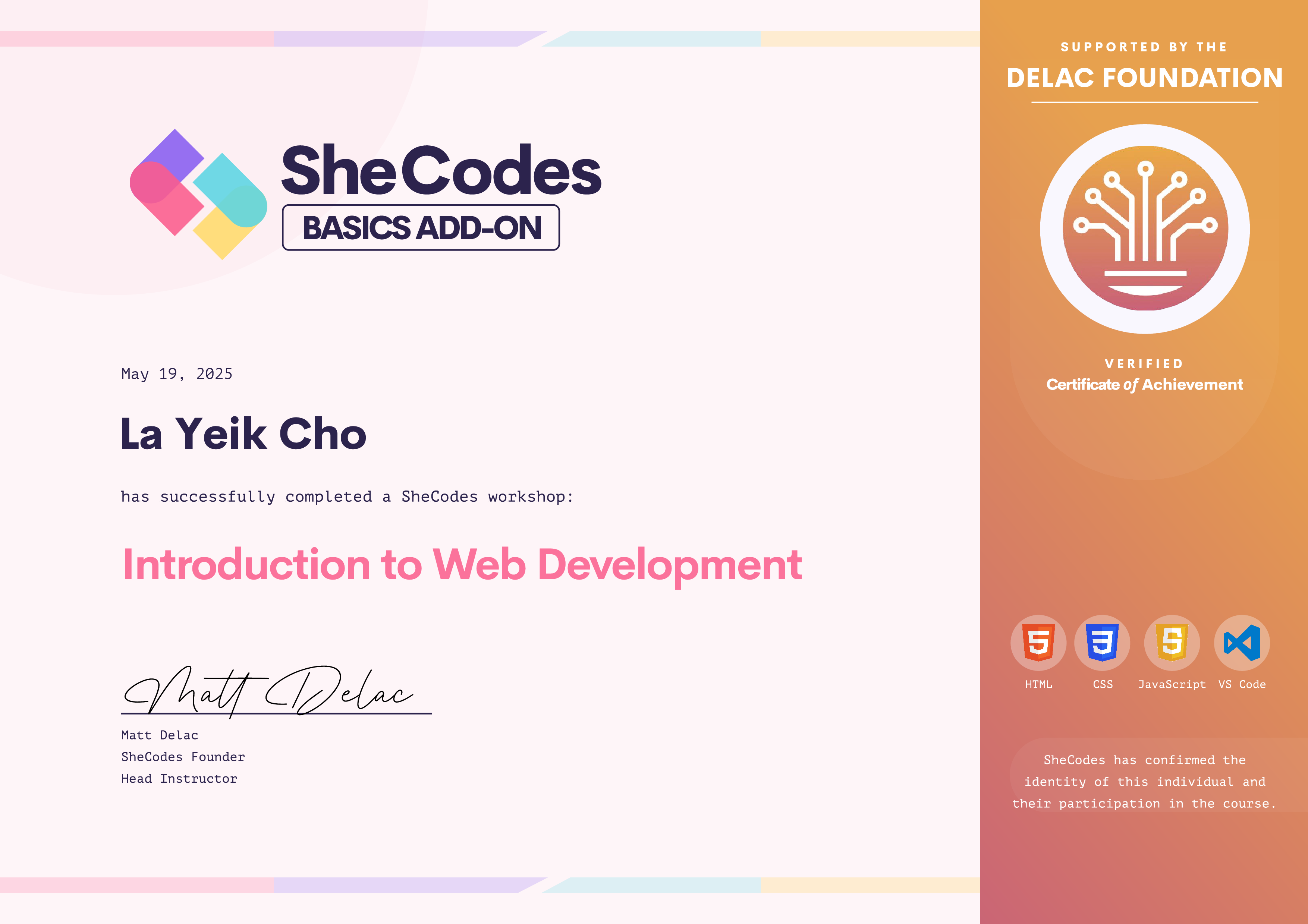 La Yeik has been fully supported by the Delac Foundation to complete this SheCodes Workshop