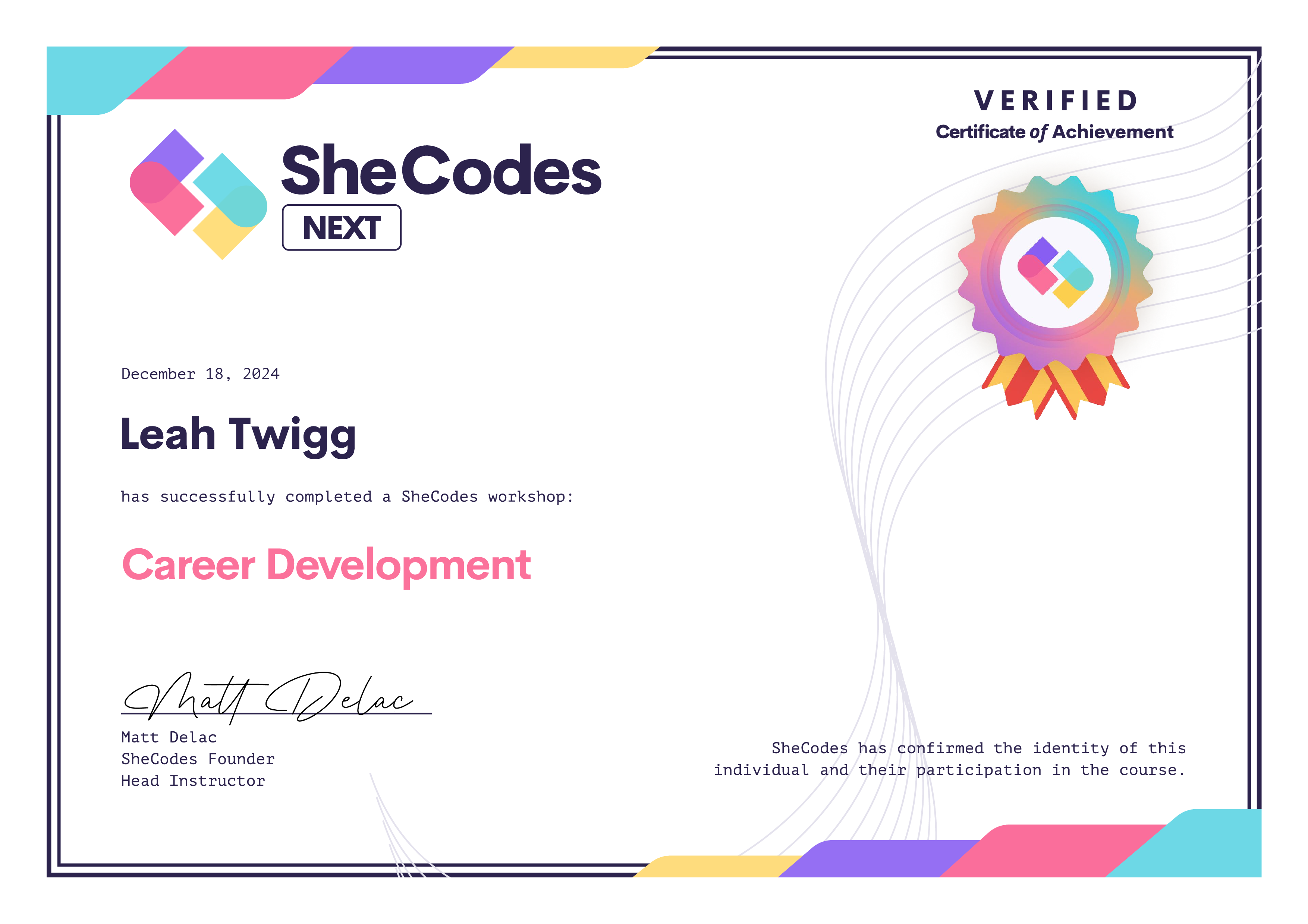 Leah successfully graduated from at least one SheCodes Coding Workshop and is featured in the SheCodes Hall of Fame