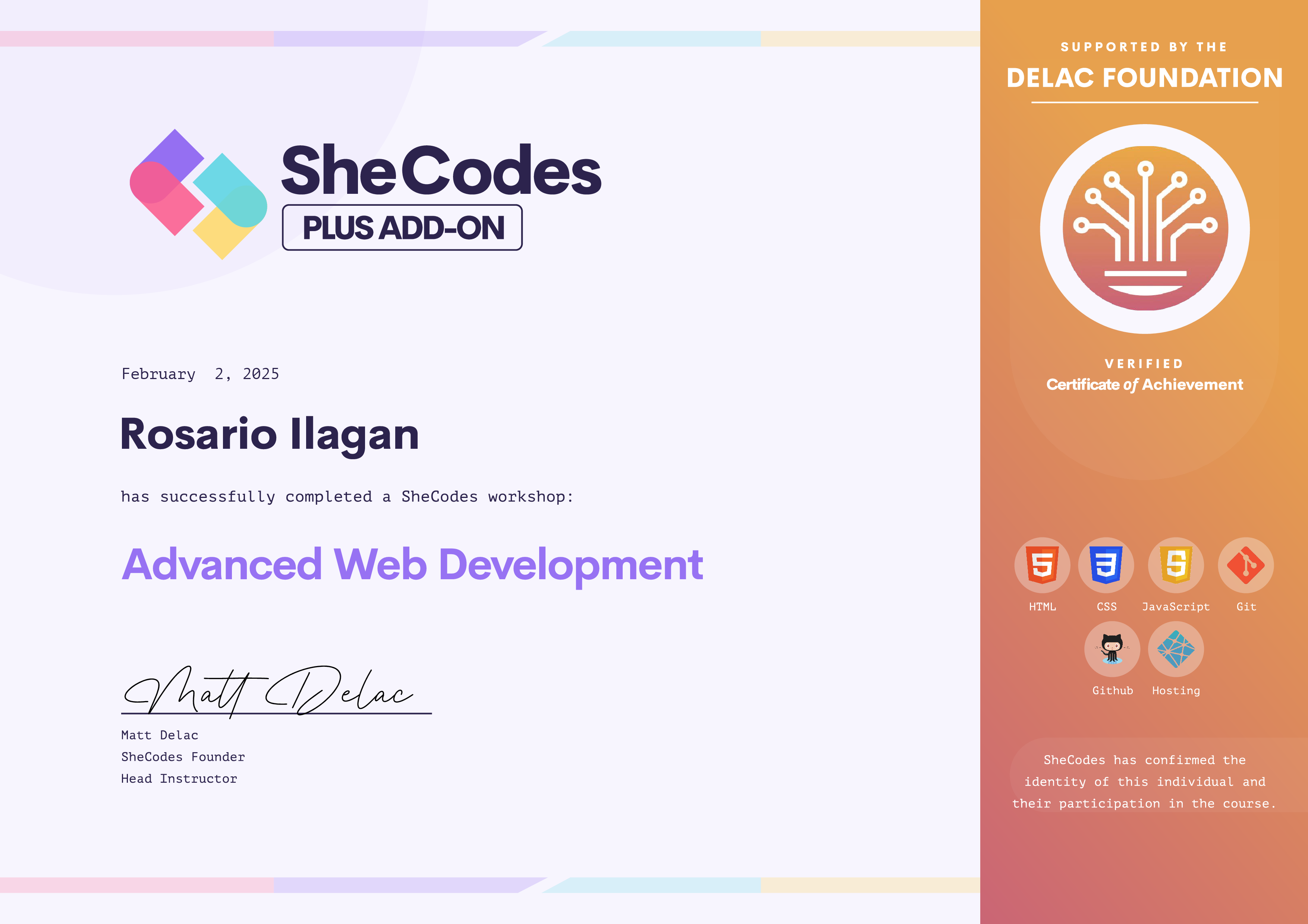 Rosario has been fully supported by the Delac Foundation to complete this SheCodes Workshop