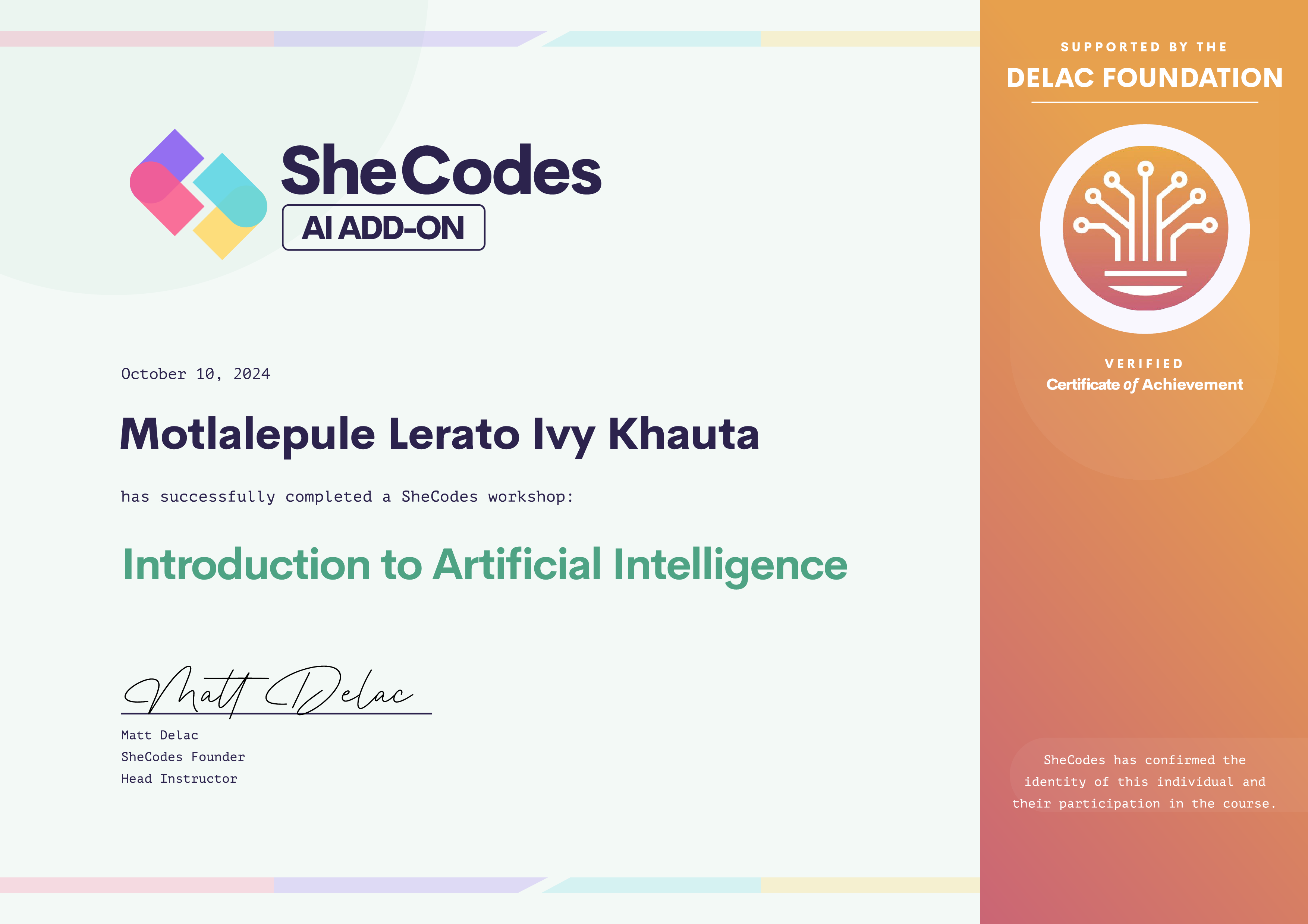 Motlalepule Lerato Ivy has been fully supported by the Delac Foundation to complete this SheCodes Workshop