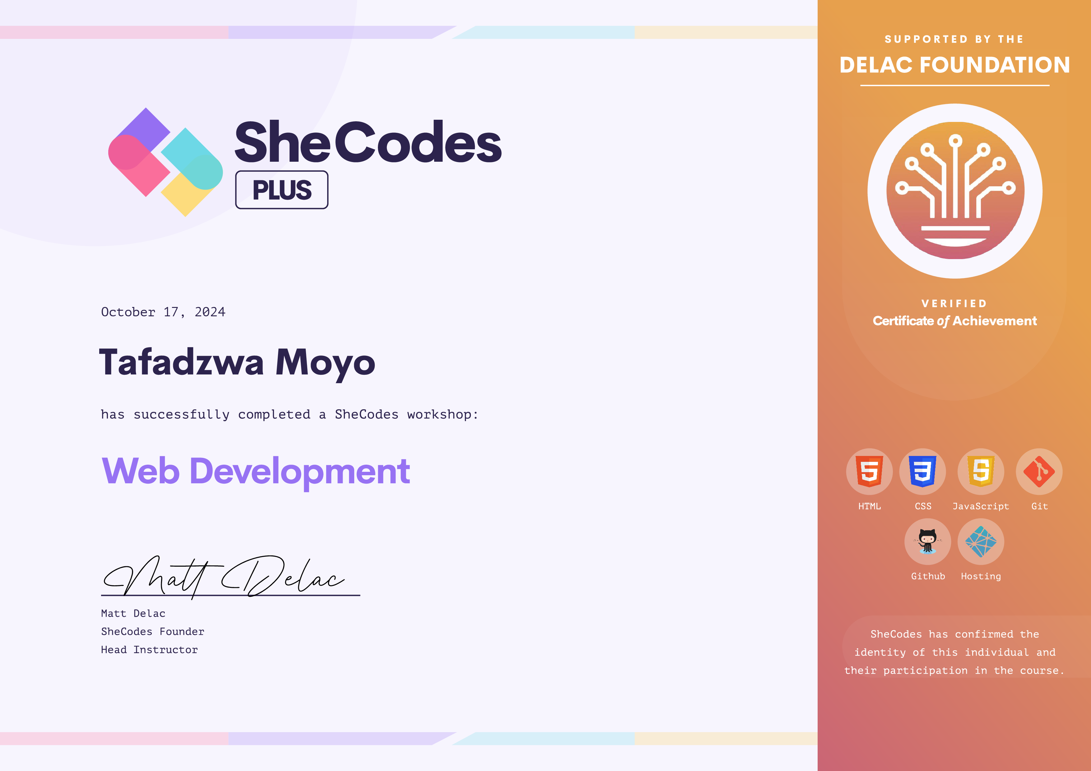 Tafadzwa has been fully supported by the Delac Foundation to complete this SheCodes Workshop