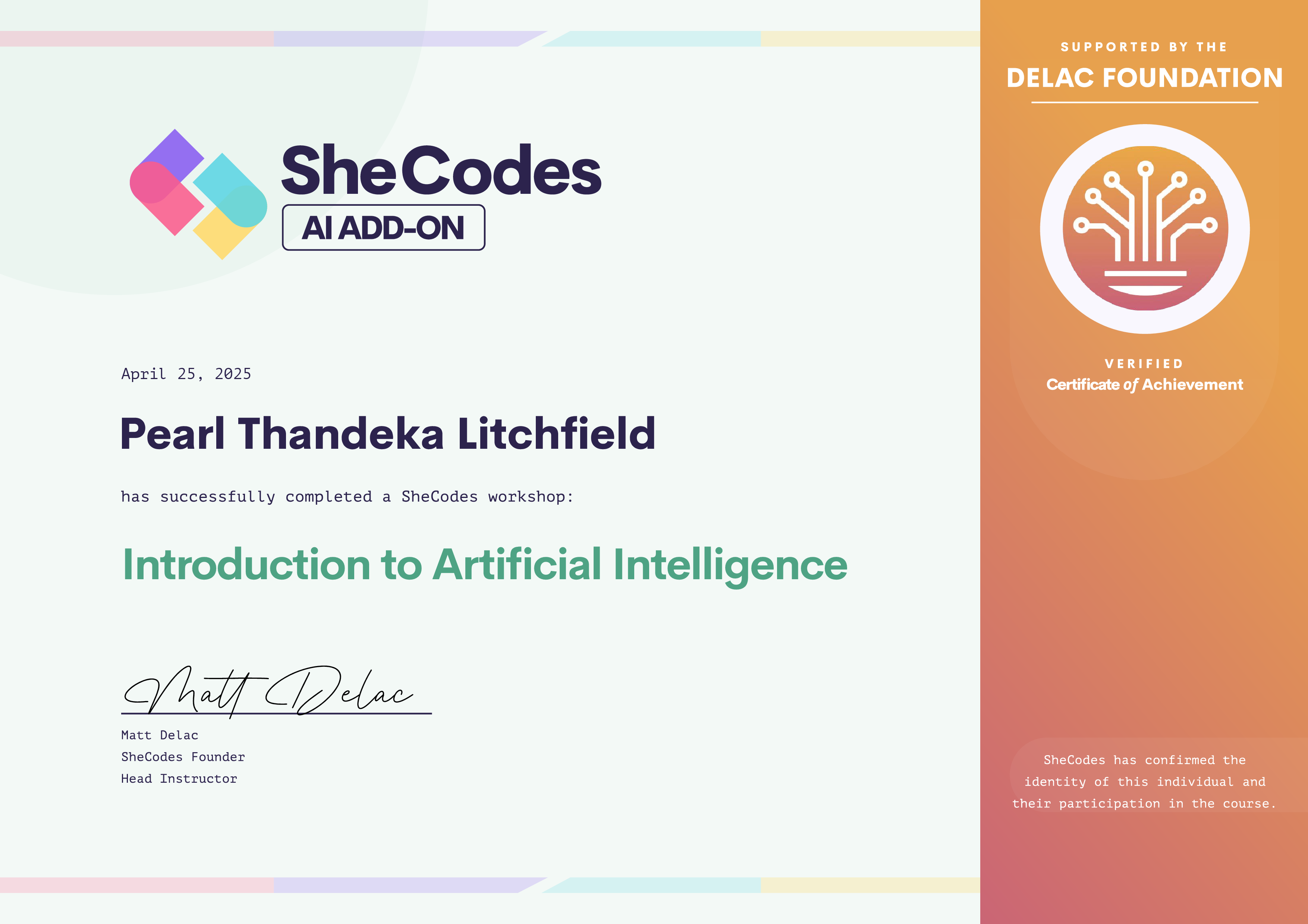 Pearl Thandeka has been fully supported by the Delac Foundation to complete this SheCodes Workshop