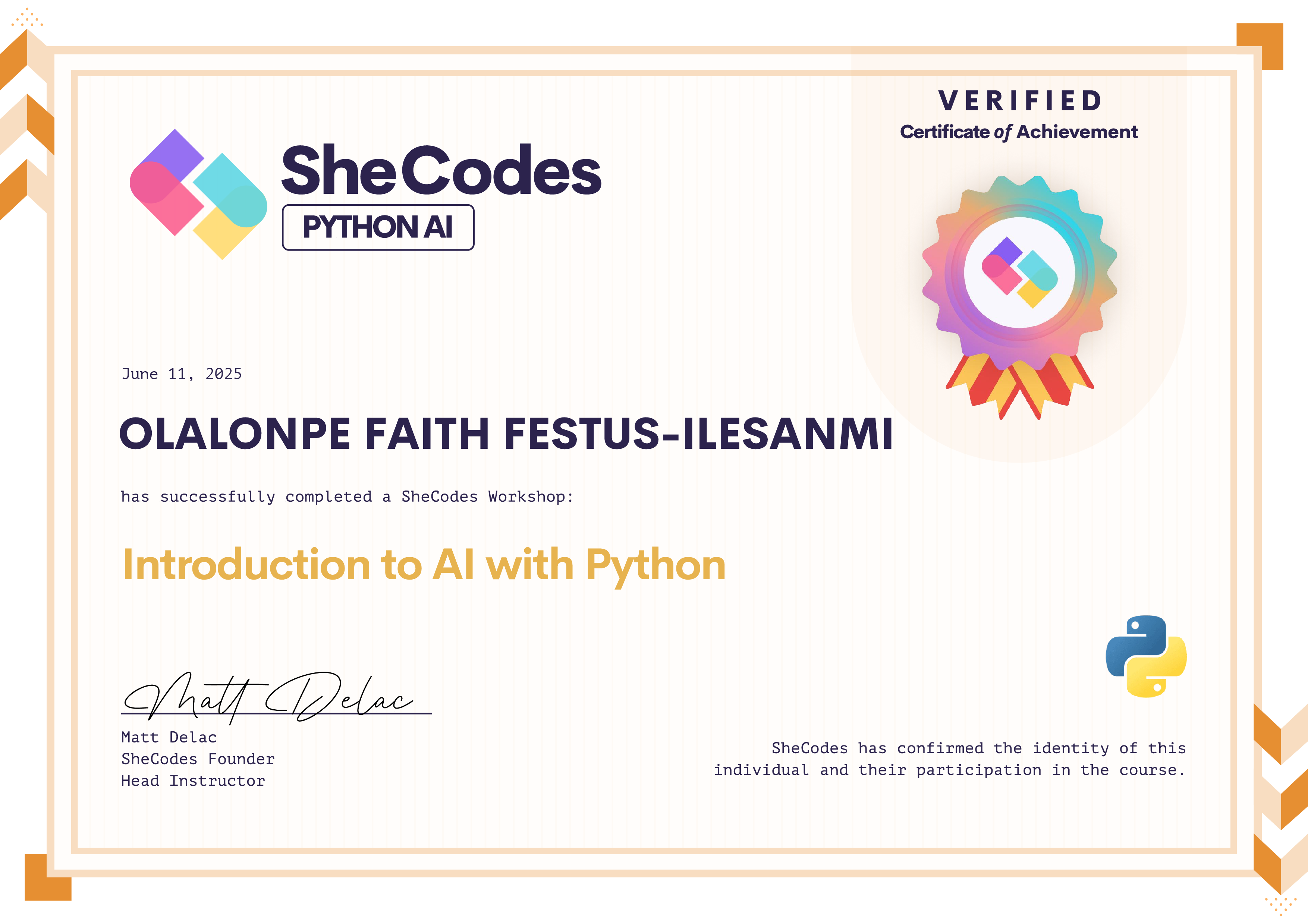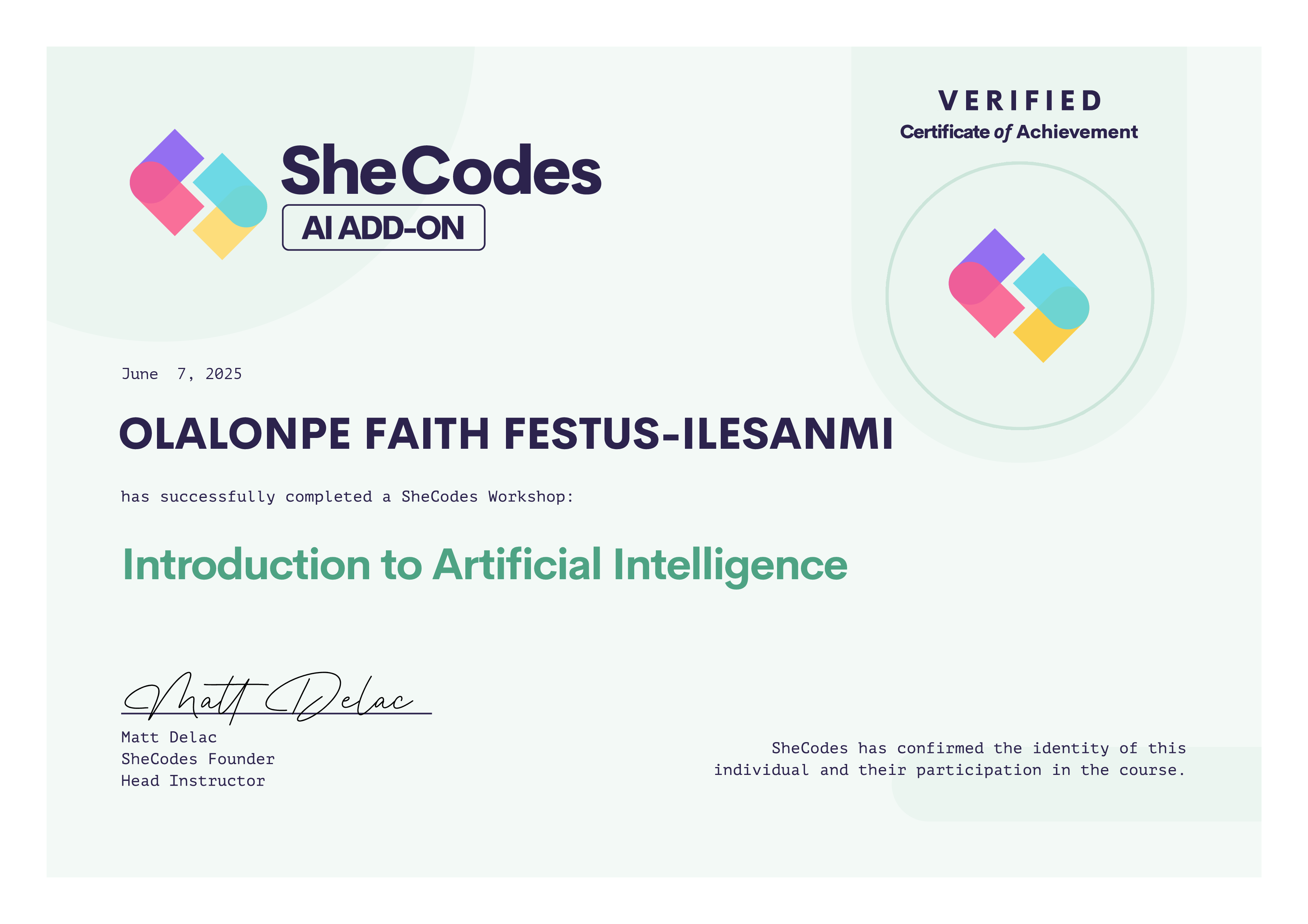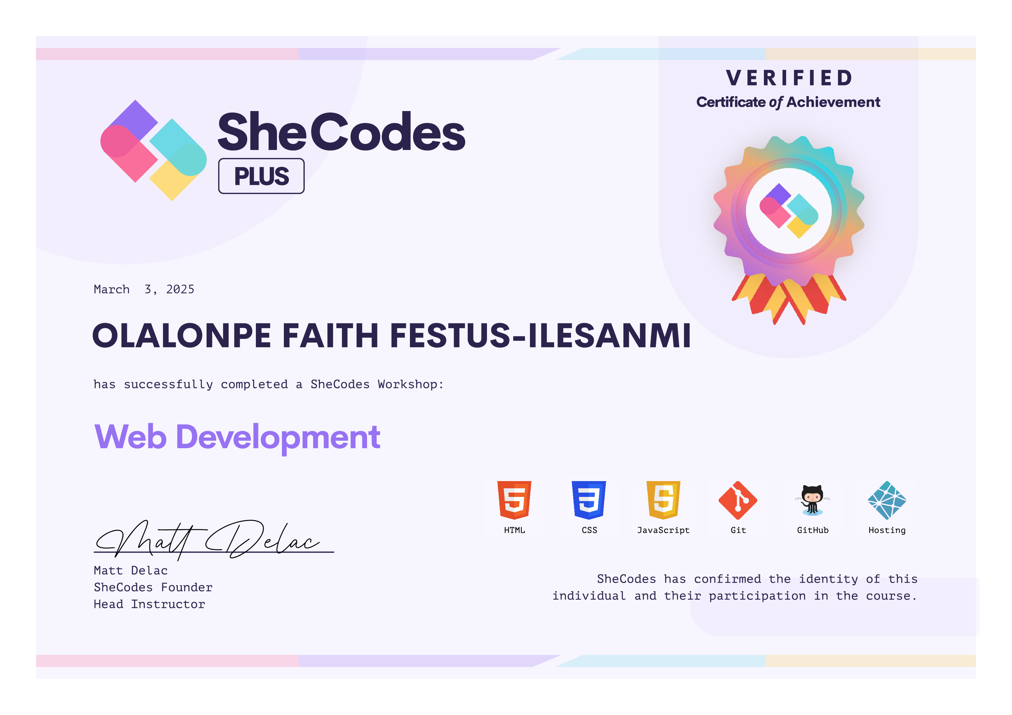 OLALONPE FAITH successfully graduated from at least one SheCodes Coding Workshop and is featured in the SheCodes Hall of Fame