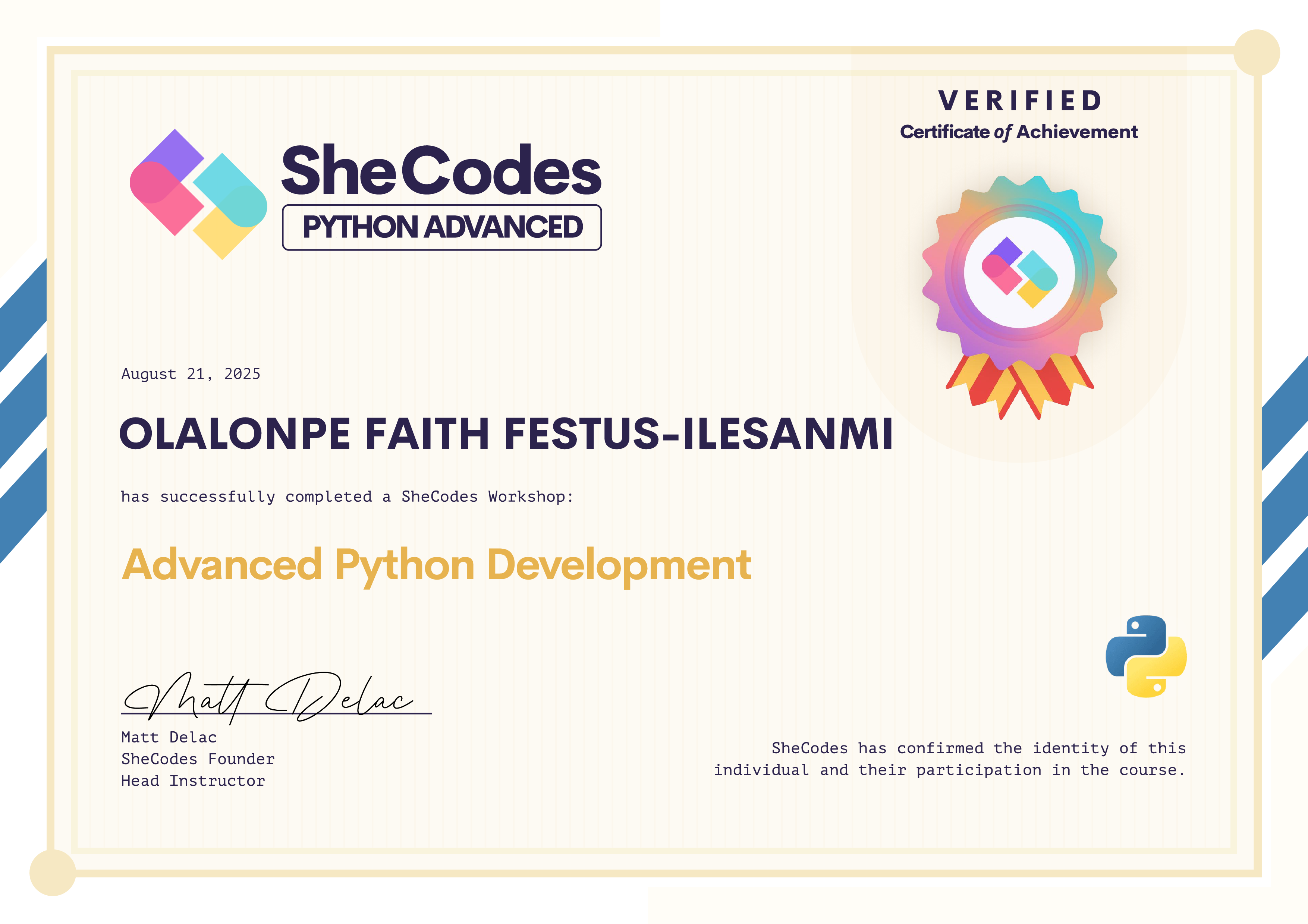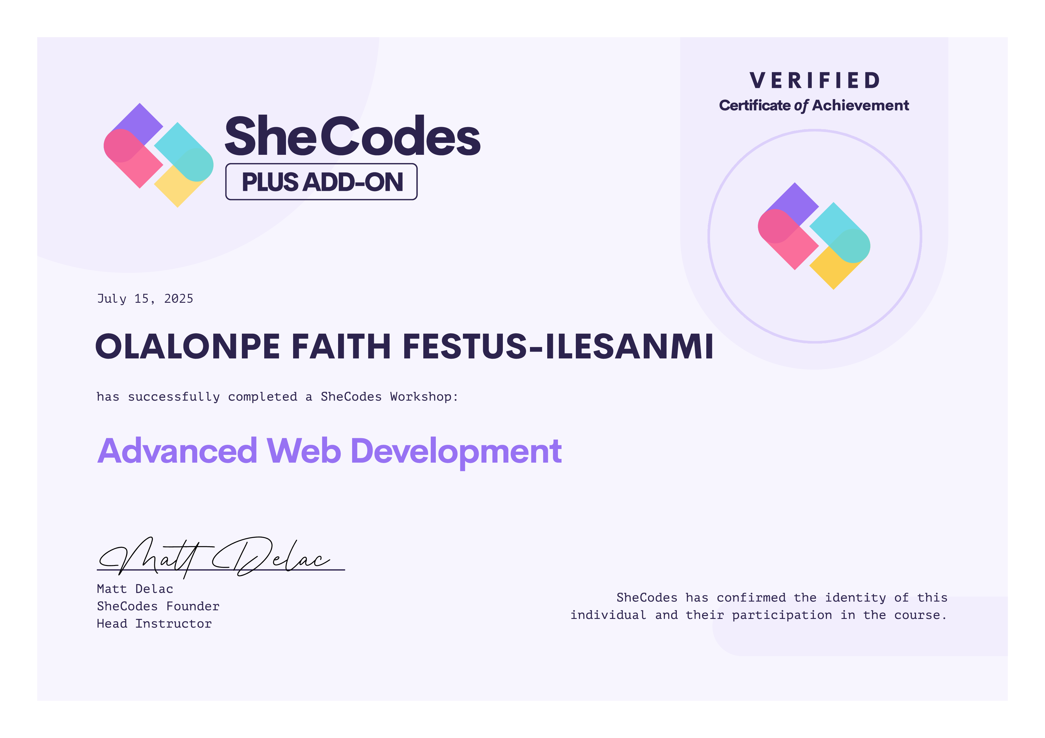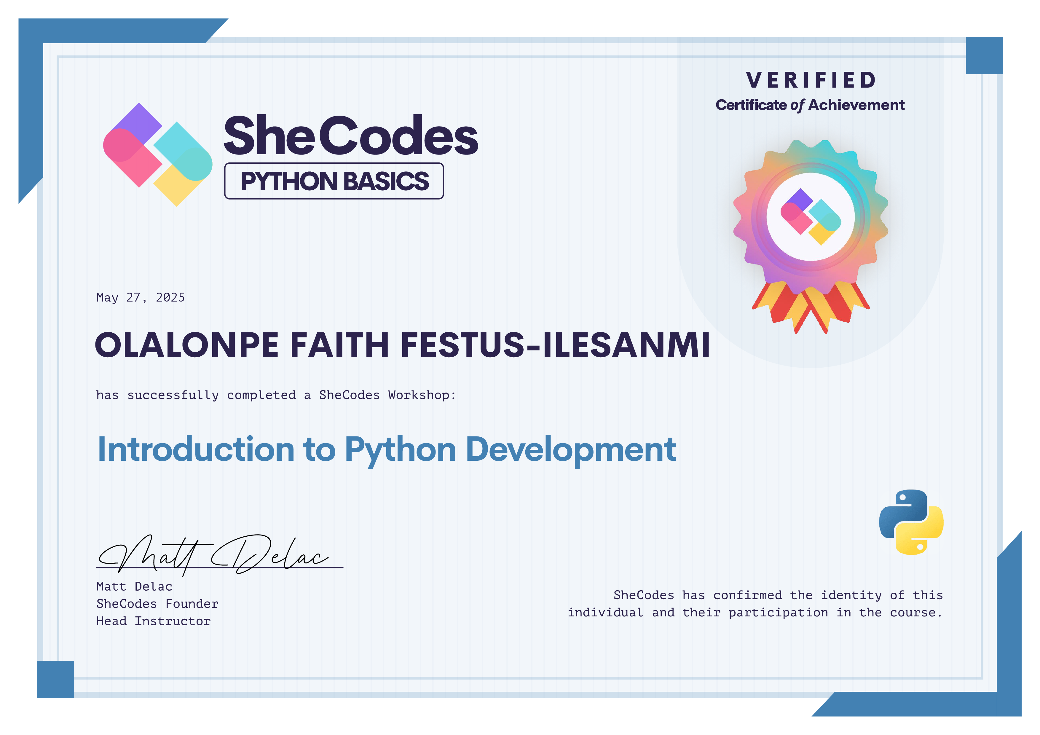 OLALONPE FAITH successfully graduated from at least one SheCodes Coding Workshop and is featured in the SheCodes Hall of Fame