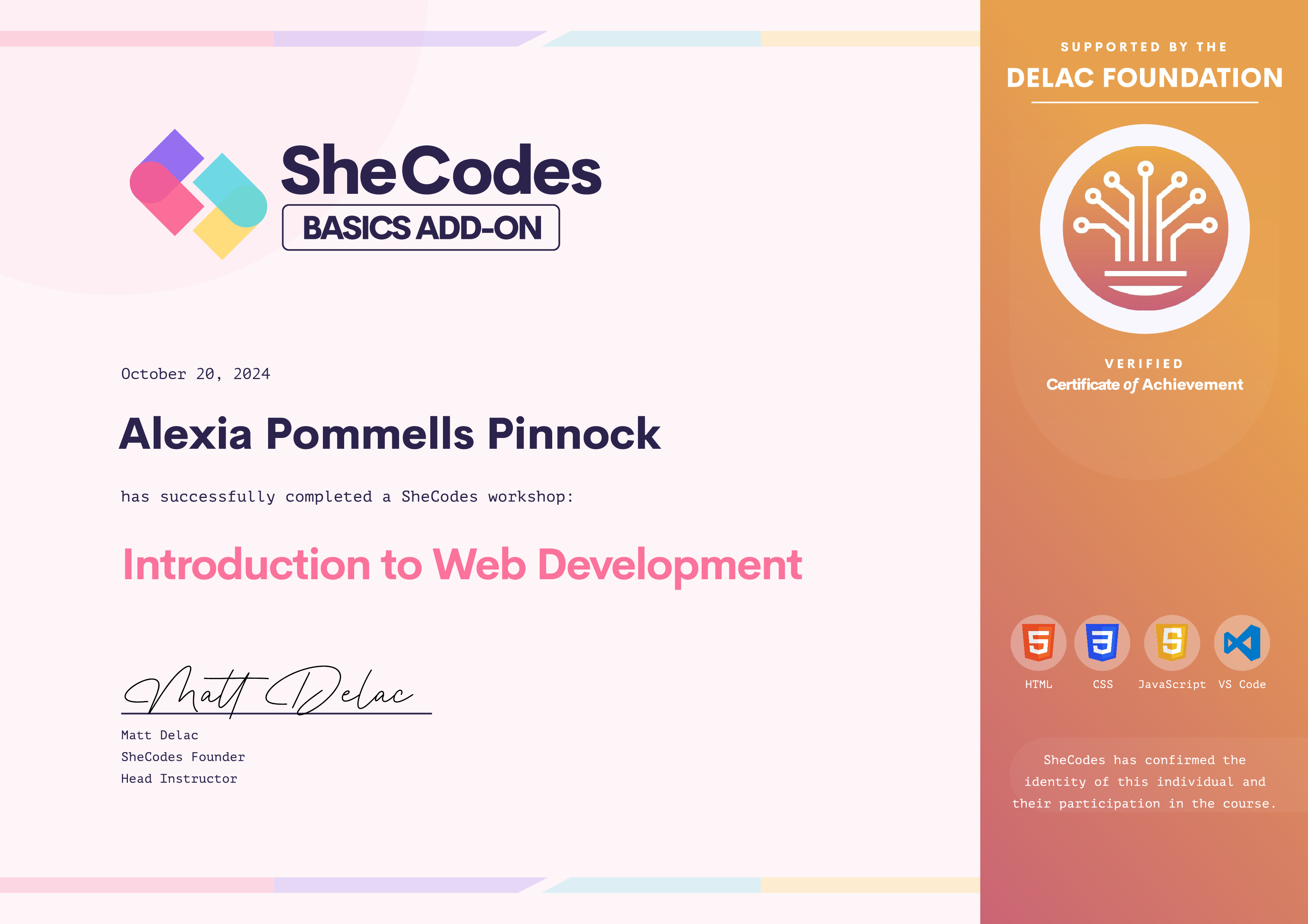Alexia has been fully supported by the Delac Foundation to complete this SheCodes Workshop