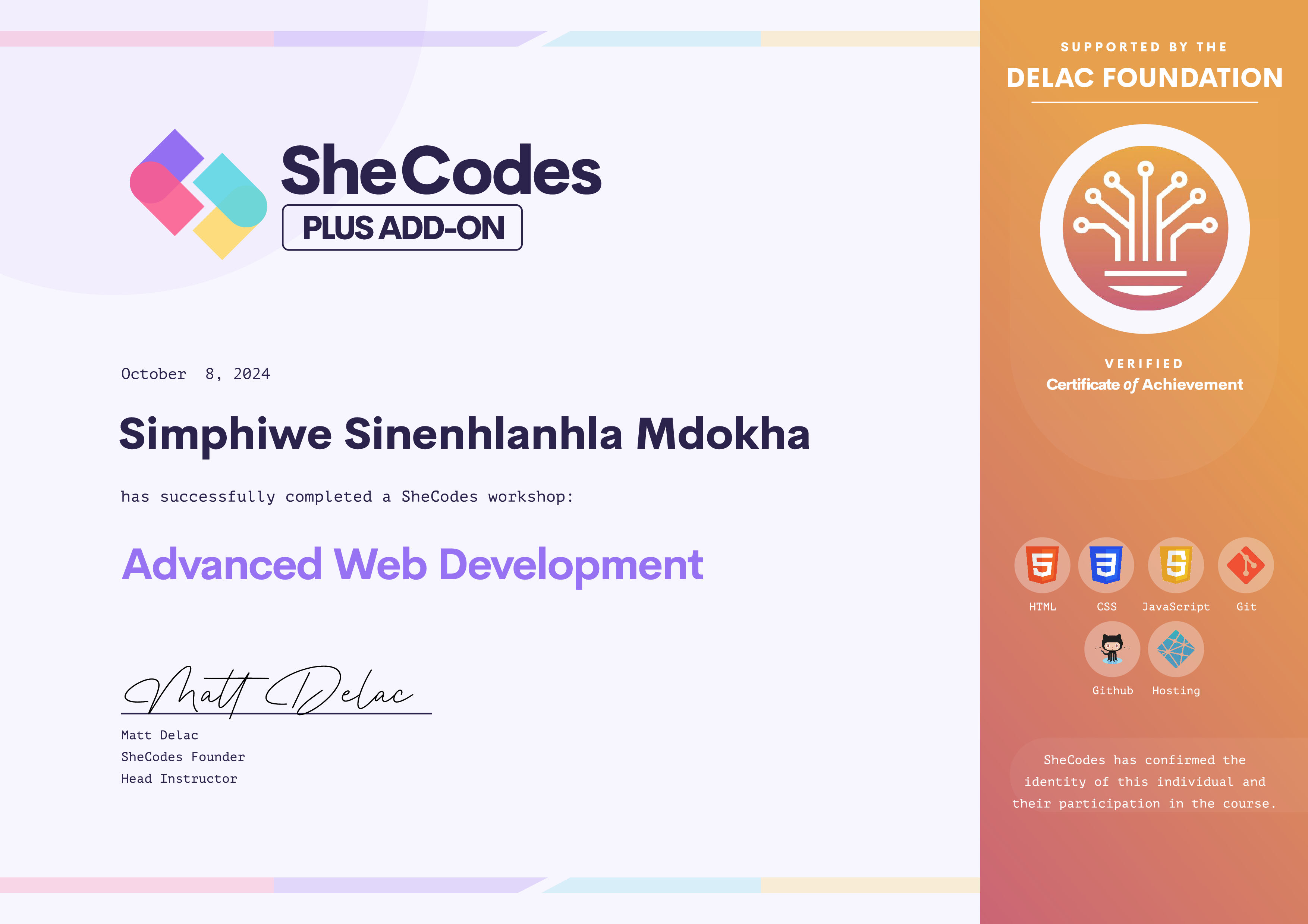 Simphiwe Sinenhlanhla has been fully supported by the Delac Foundation to complete this SheCodes Workshop