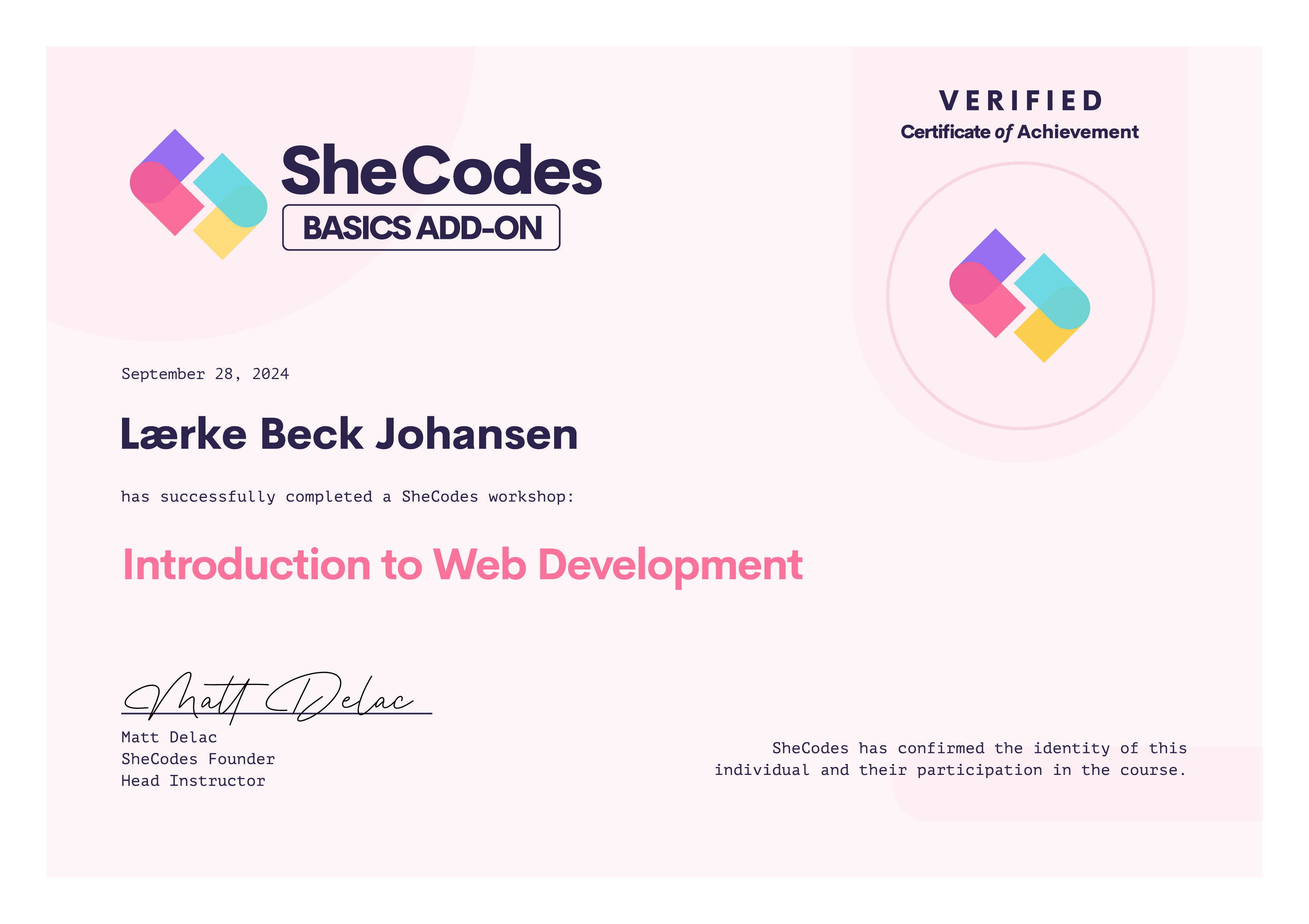 Lærke successfully graduated from at least one SheCodes Coding Workshop and is featured in the SheCodes Hall of Fame