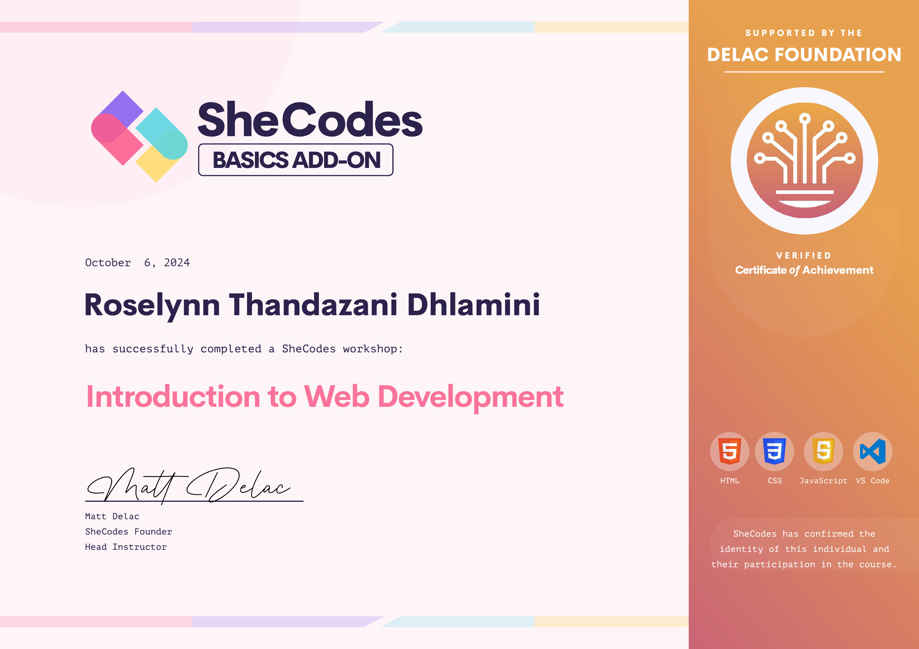 Roselynn Thandazani has been fully supported by the Delac Foundation to complete this SheCodes Workshop