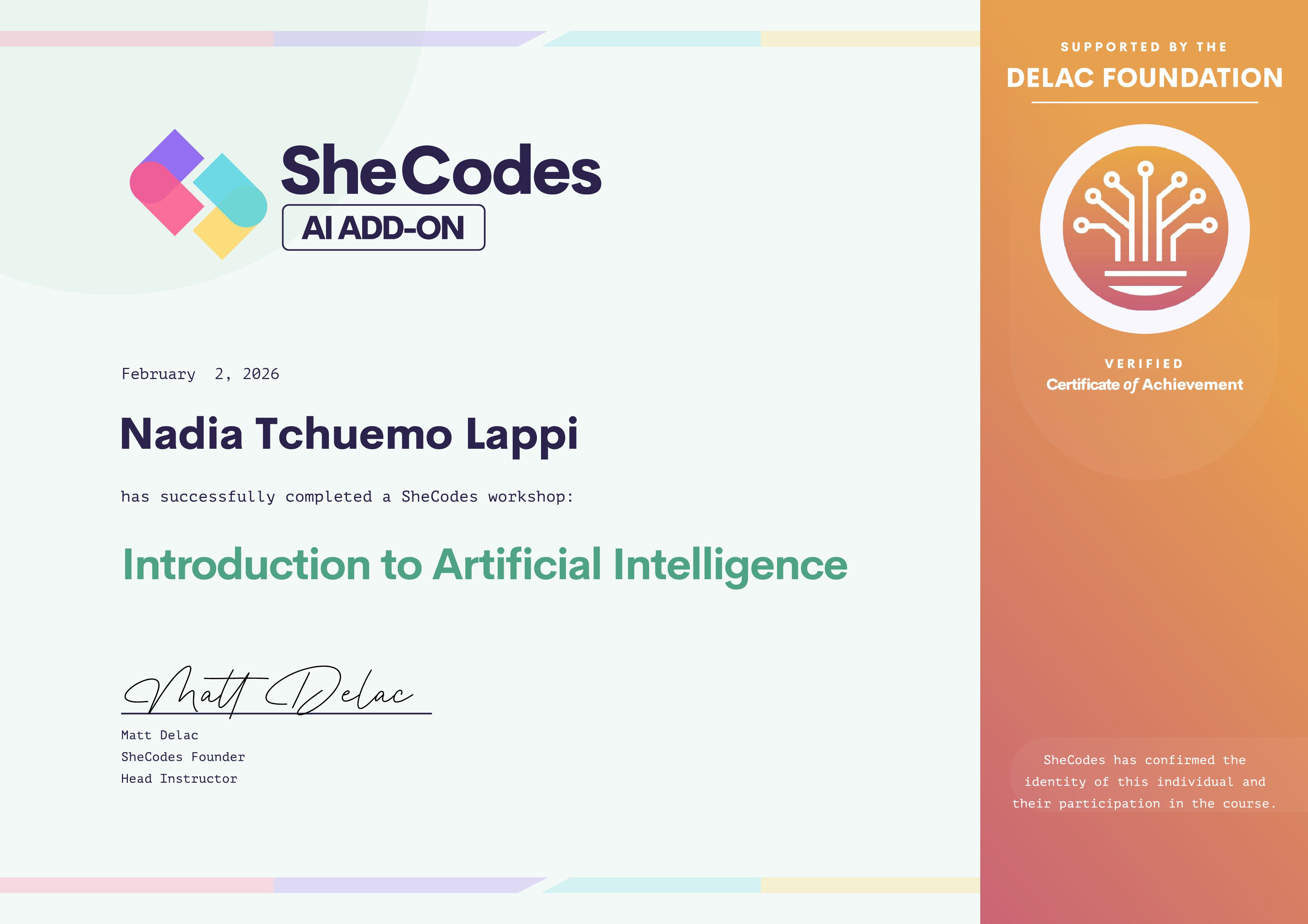 Nadia has been fully supported by the The Delac Foundation to complete this SheCodes Workshop