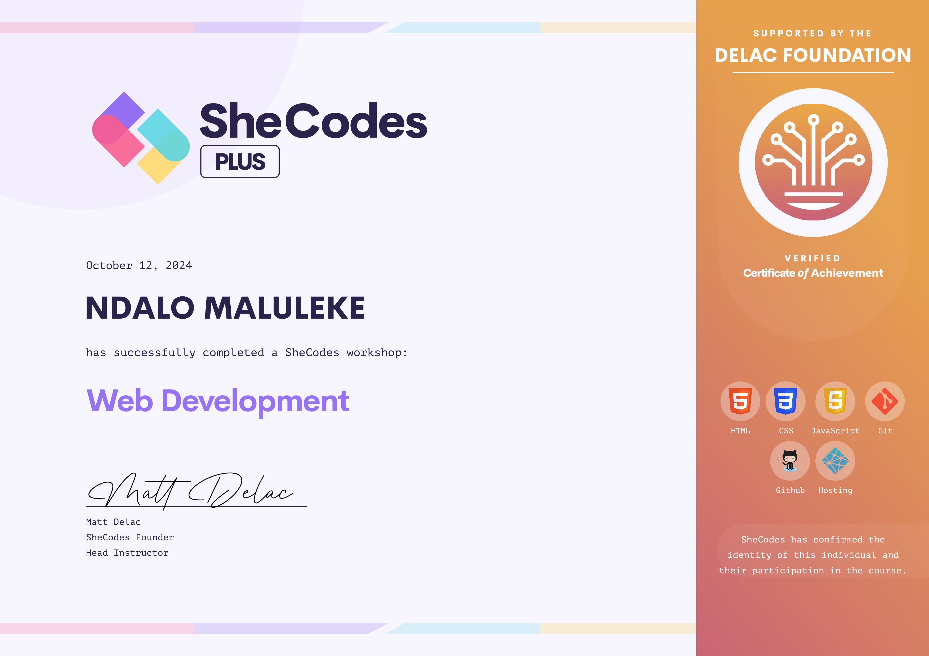 NDALO successfully graduated from at least one SheCodes Coding Workshop and is featured in the SheCodes Hall of Fame