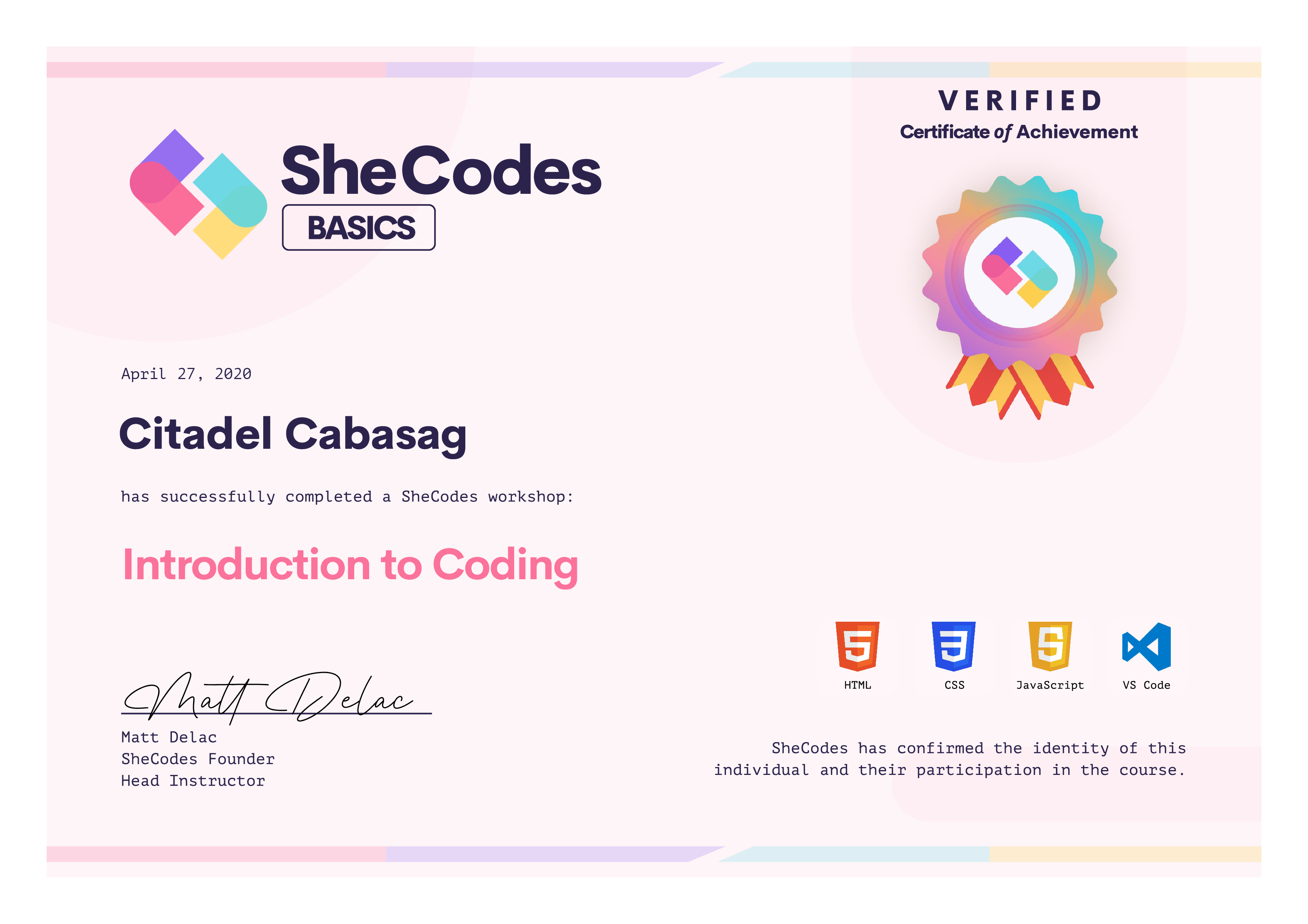 Citadel successfully graduated from at least one SheCodes Coding Workshop and is featured in the SheCodes Hall of Fame
