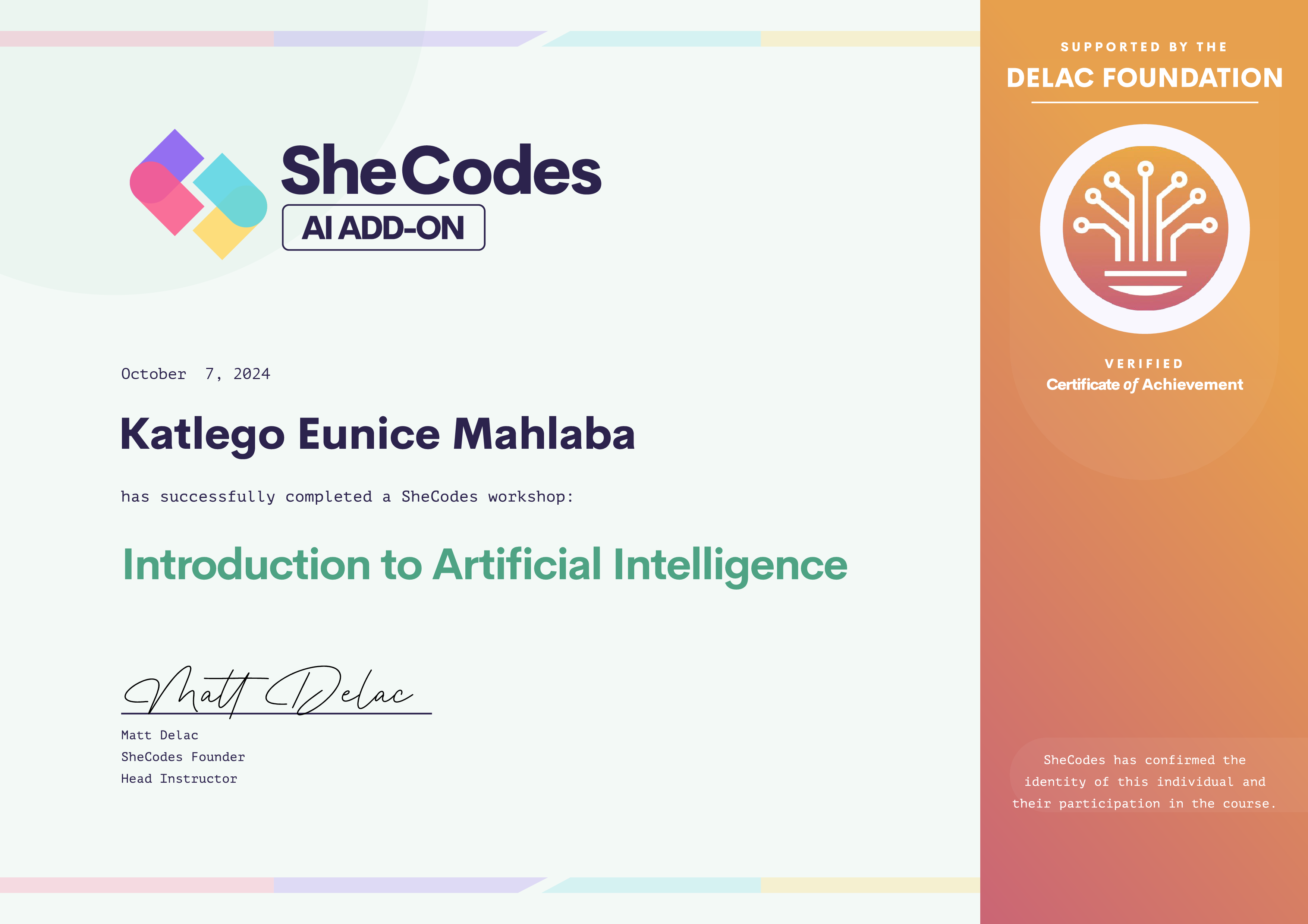 Katlego Eunice has been fully supported by the Delac Foundation to complete this SheCodes Workshop