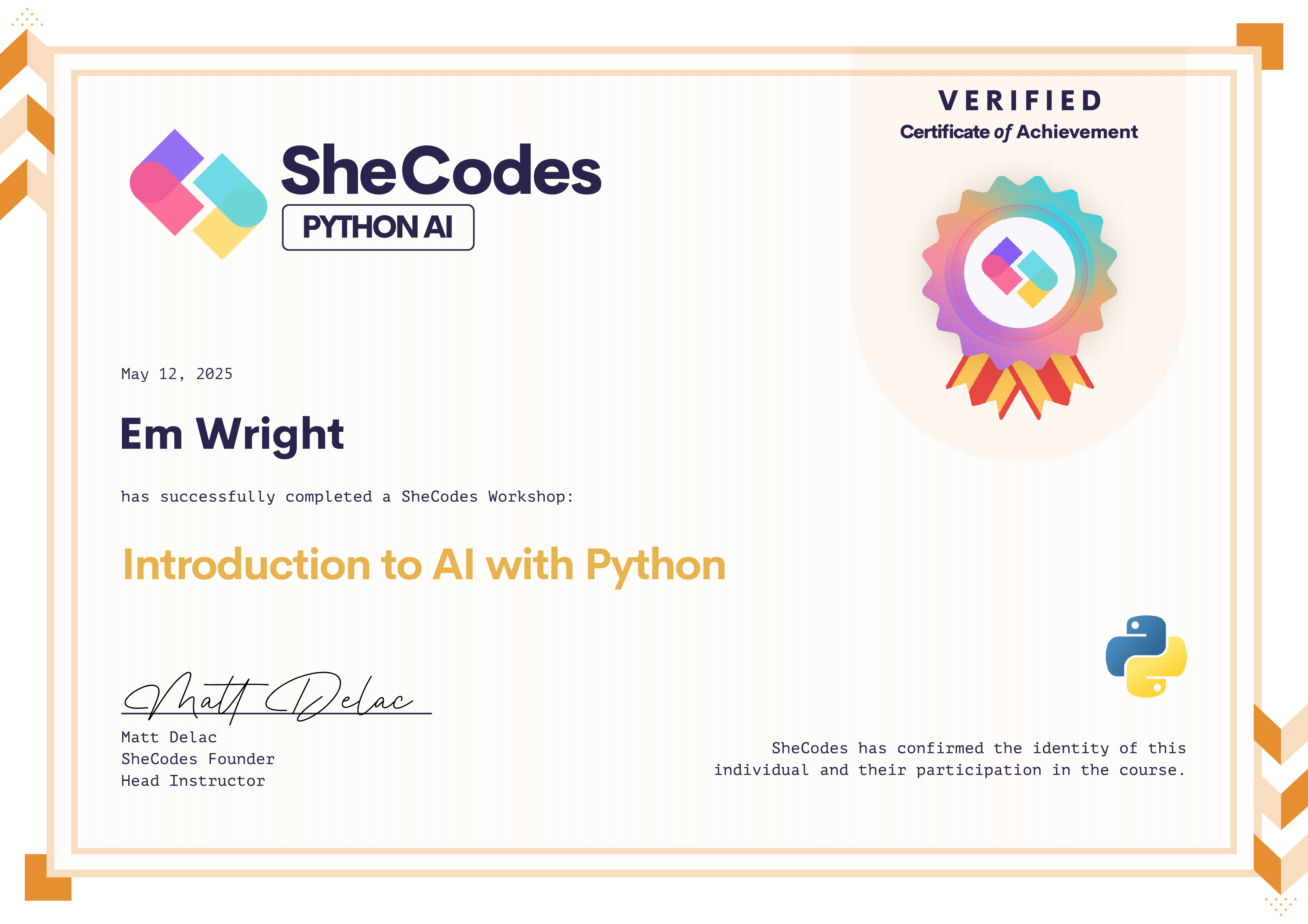 Em successfully graduated from at least one SheCodes Coding Workshop and is featured in the SheCodes Hall of Fame