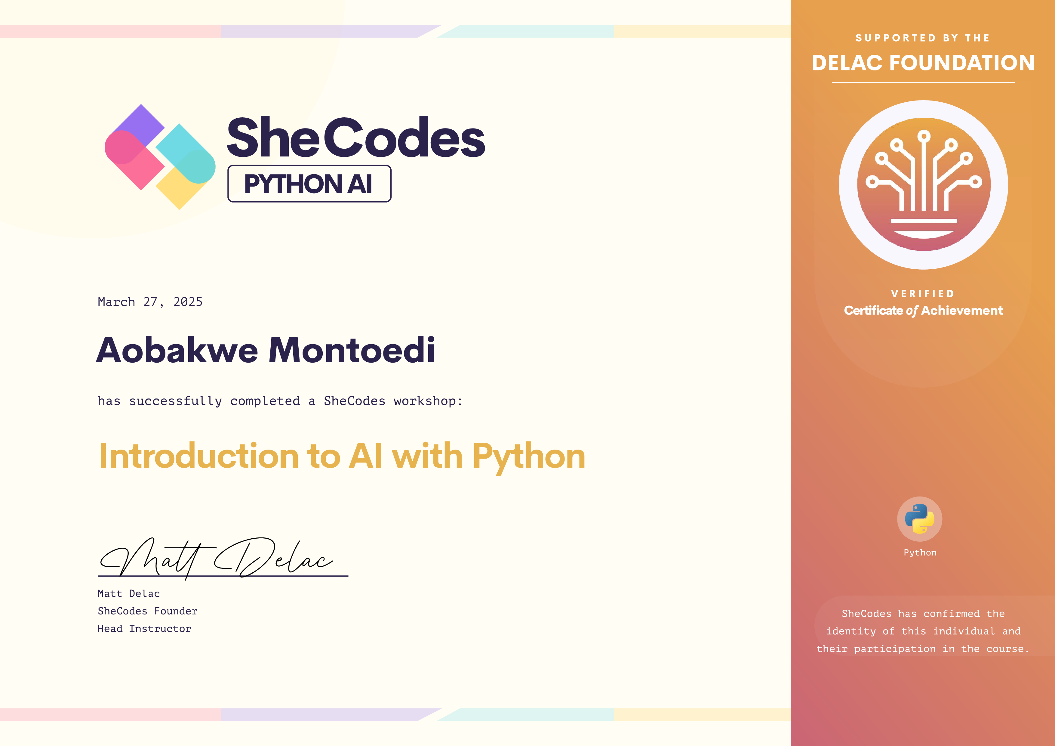 Aobakwe has been fully supported by the Delac Foundation to complete this SheCodes Workshop