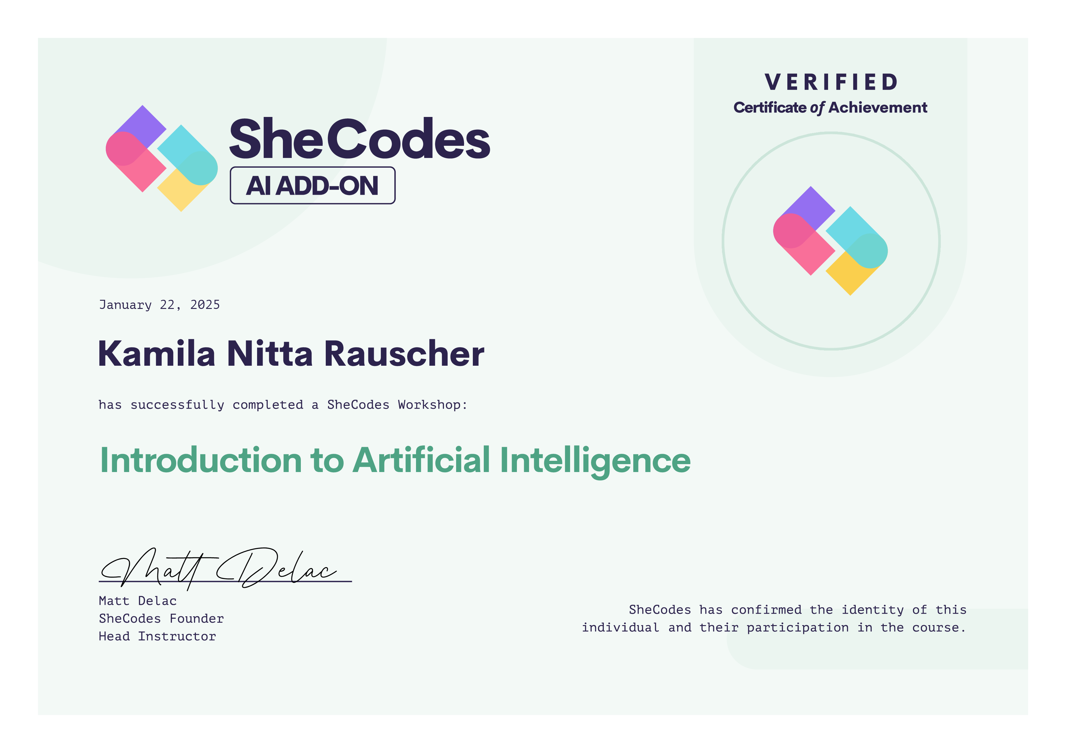Kamila successfully graduated from at least one SheCodes Coding Workshop and is featured in the SheCodes Hall of Fame