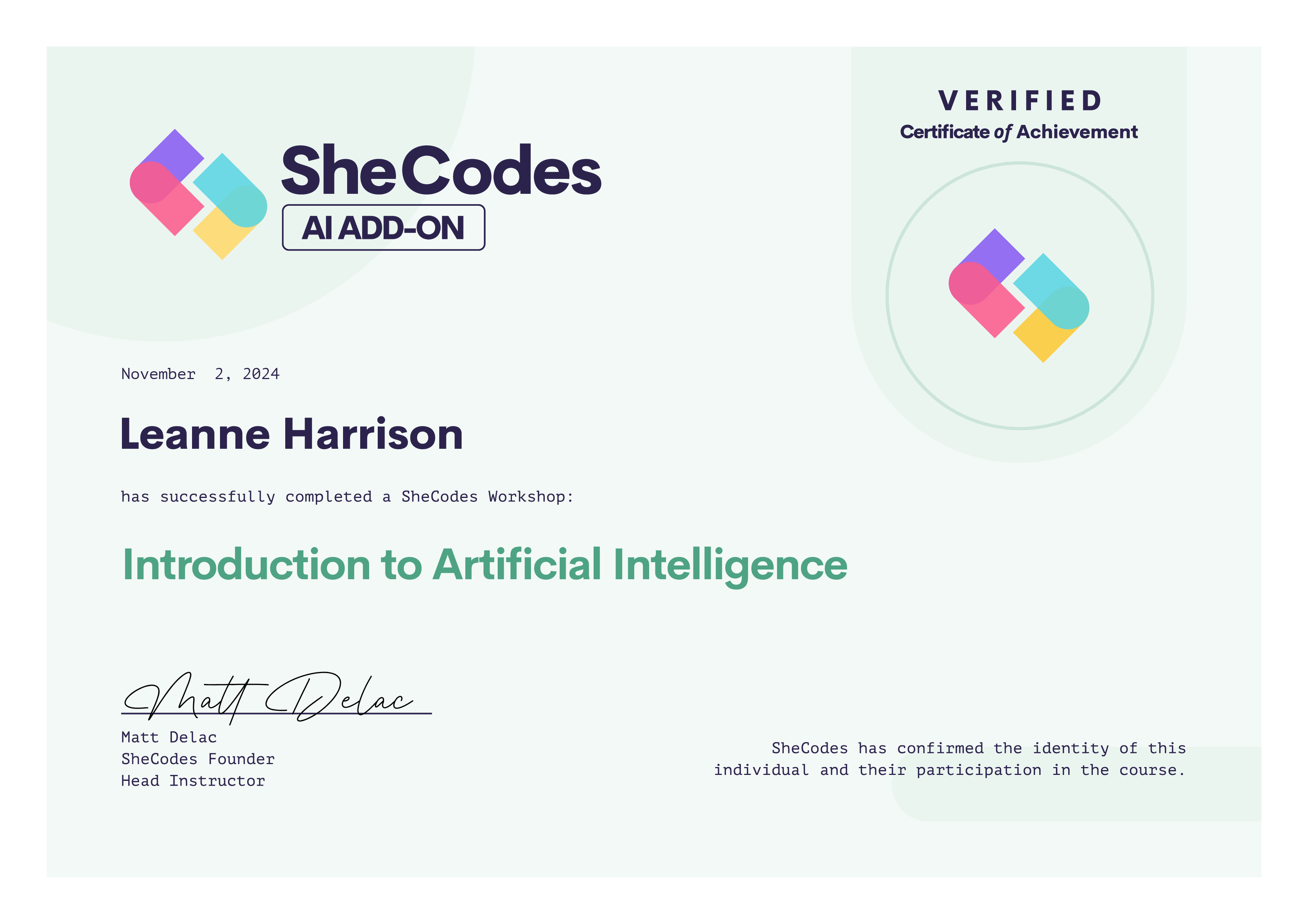 Leanne successfully graduated from at least one SheCodes Coding Workshop and is featured in the SheCodes Hall of Fame