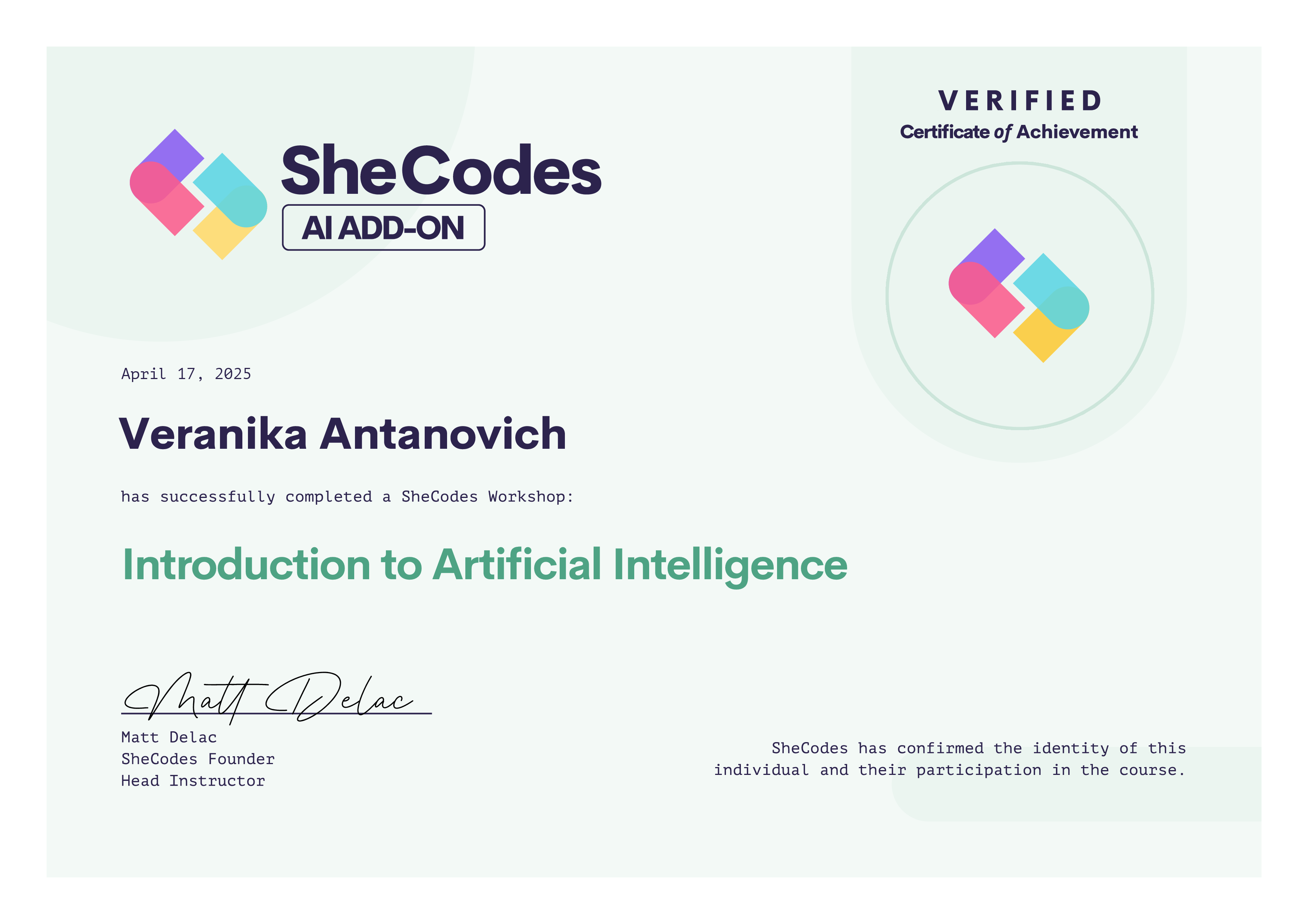 Veranika successfully graduated from at least one SheCodes Coding Workshop and is featured in the SheCodes Hall of Fame