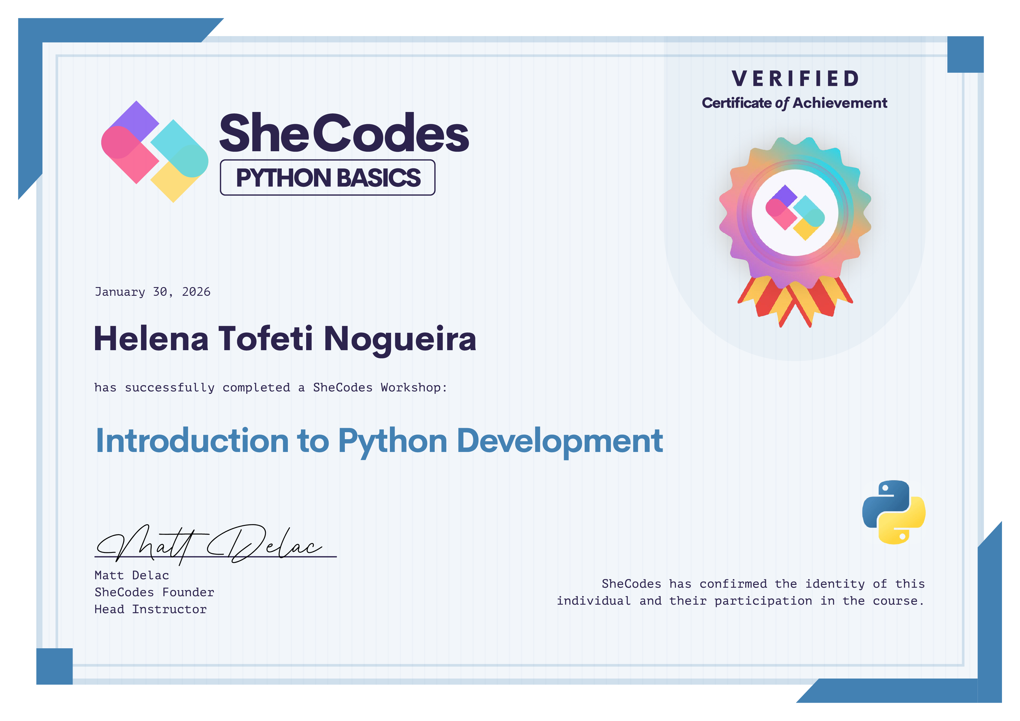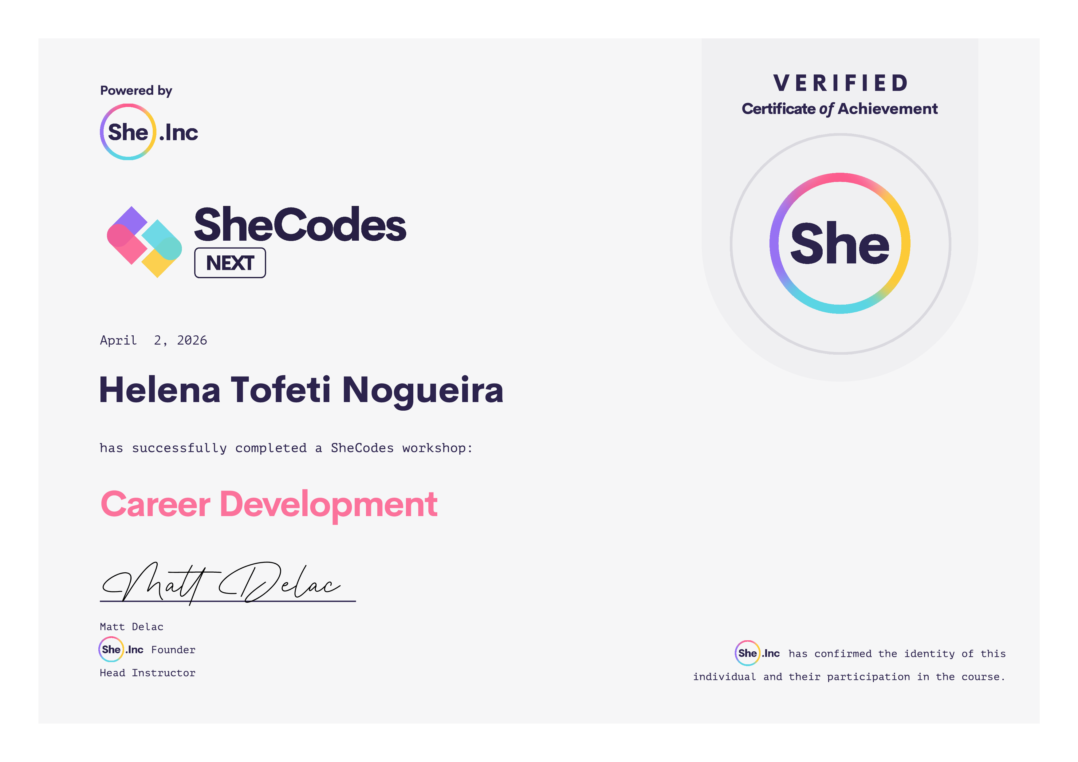 Helena successfully graduated from at least one SheCodes Coding Workshop and is featured in the SheCodes Hall of Fame