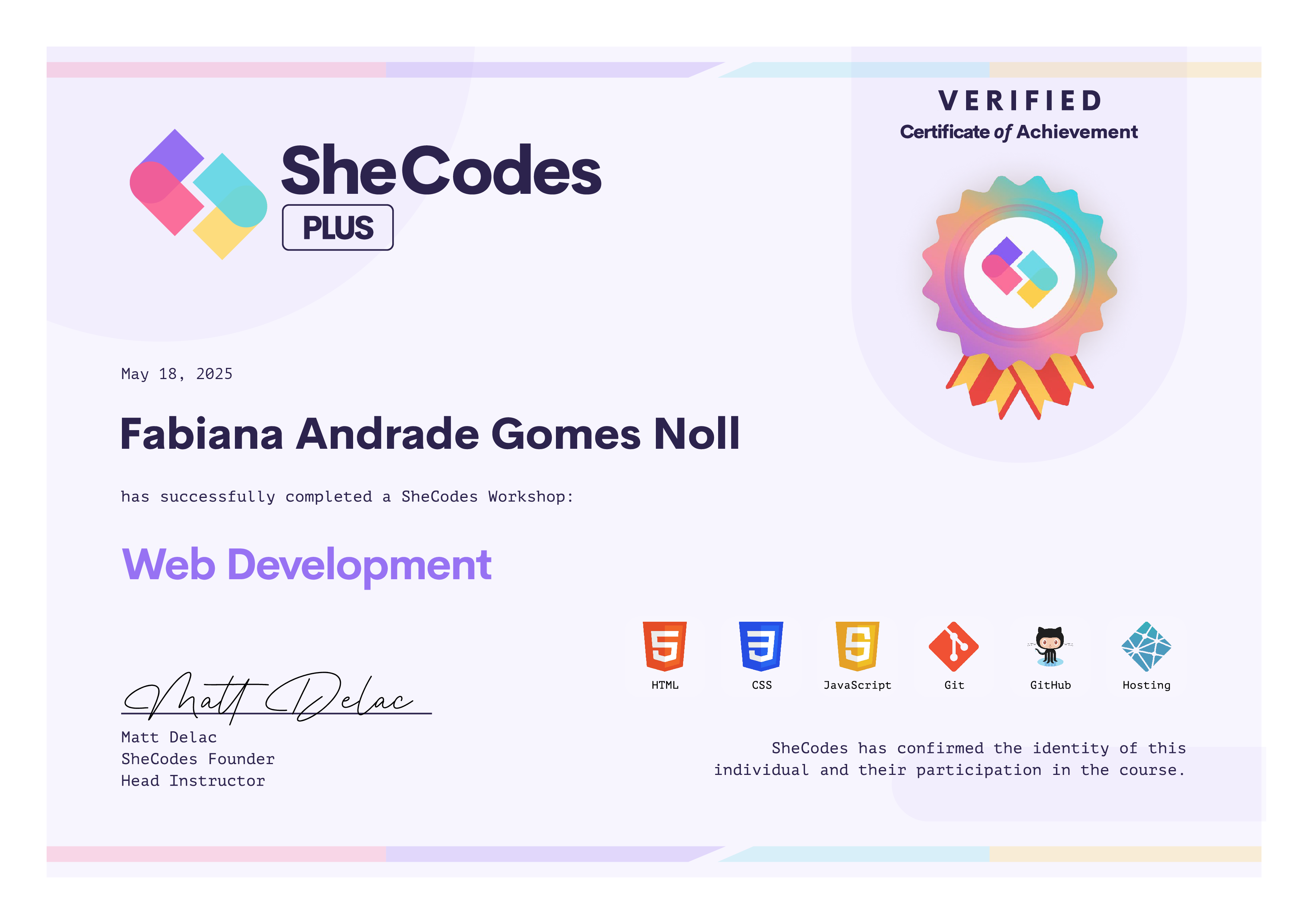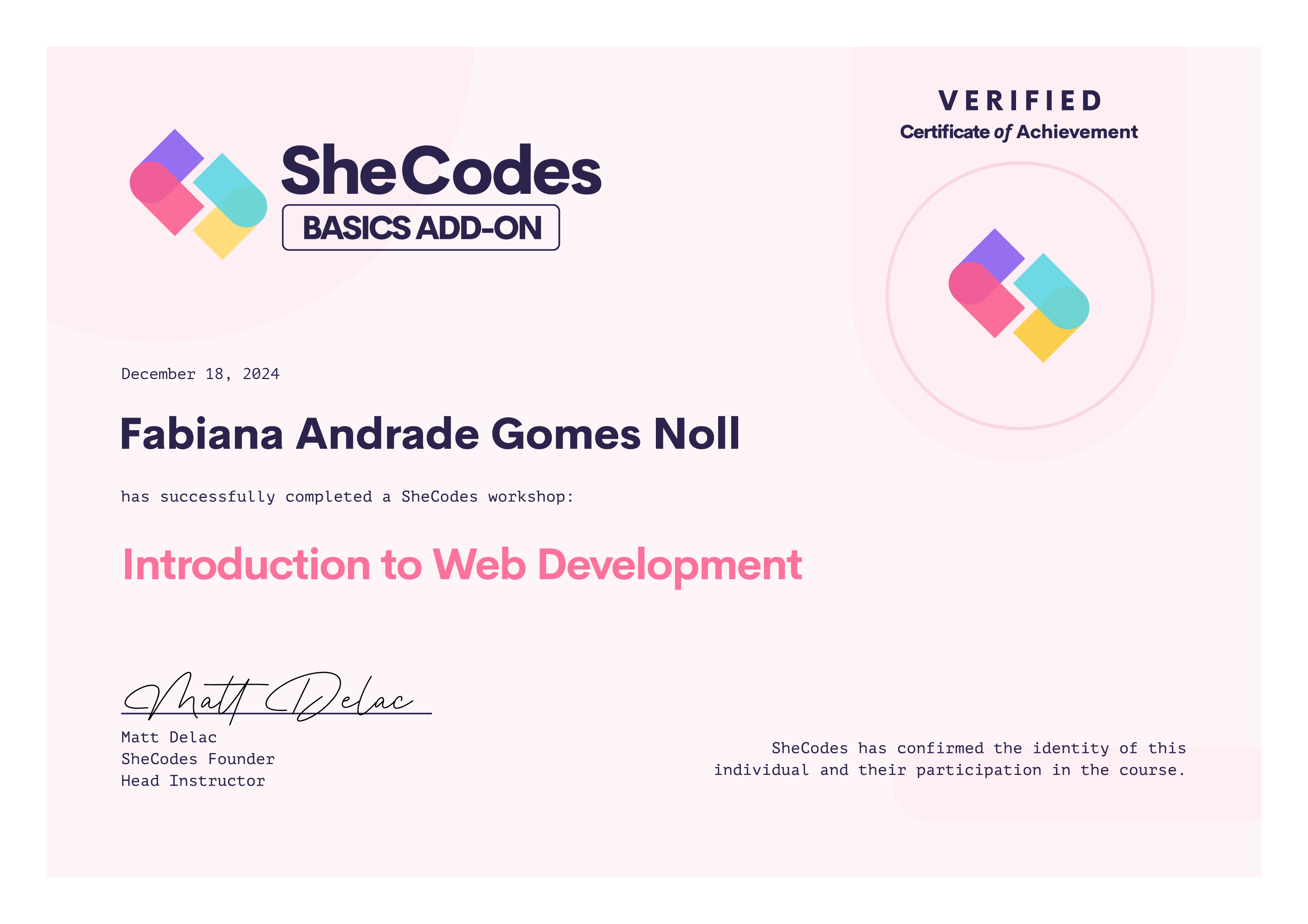 Fabiana successfully graduated from at least one SheCodes Coding Workshop and is featured in the SheCodes Hall of Fame