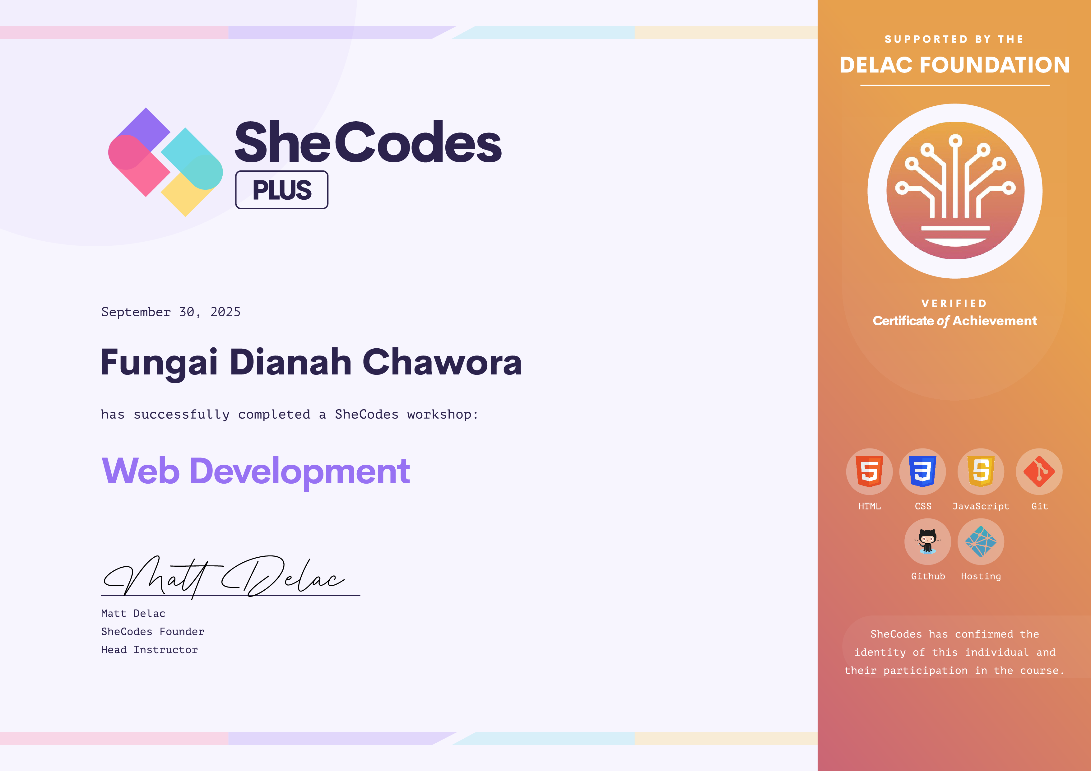 Fungai Dianah Chawora SheCodes Profile | SheCodes