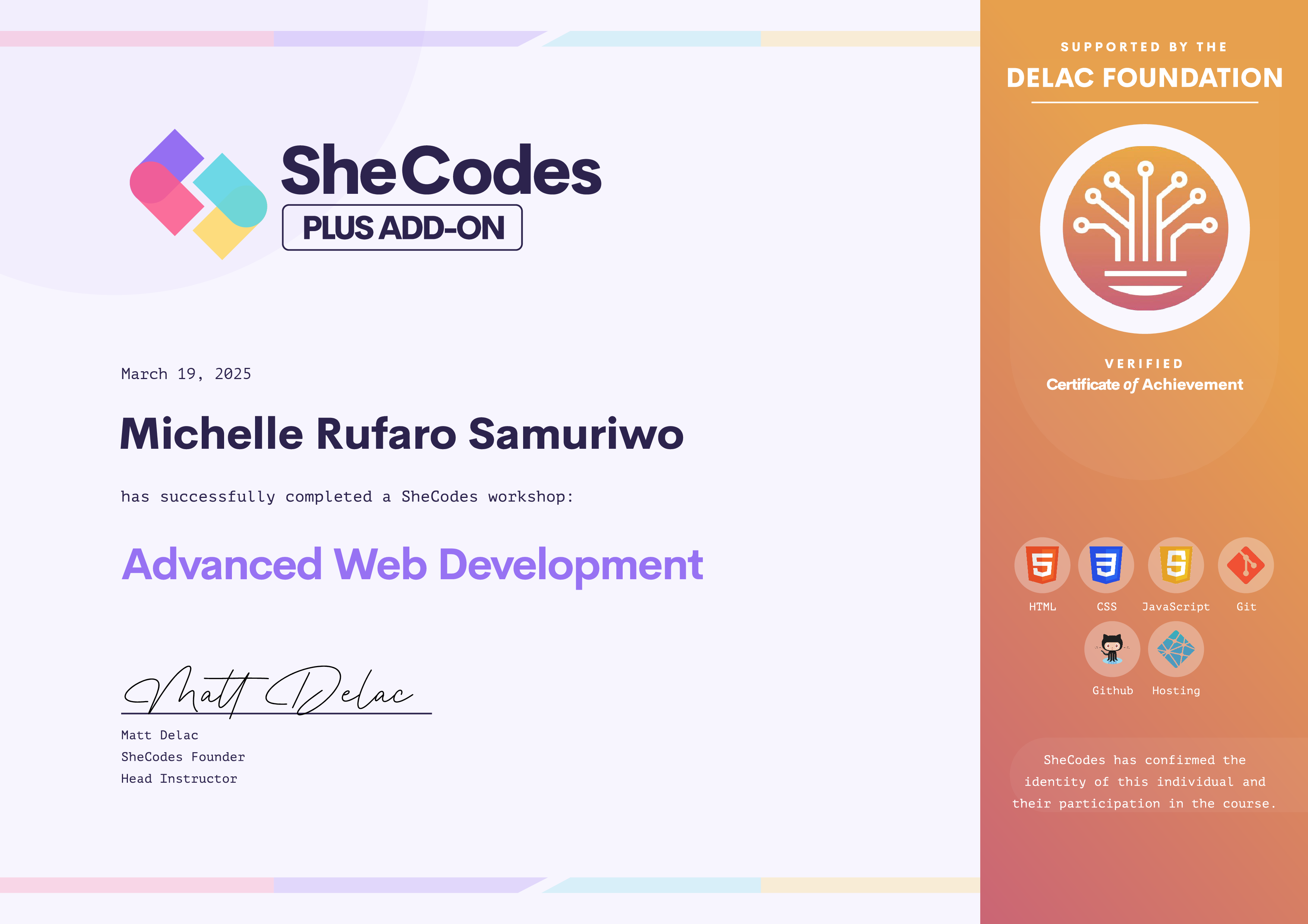 Michelle Rufaro has been fully supported by the Delac Foundation to complete this SheCodes Workshop
