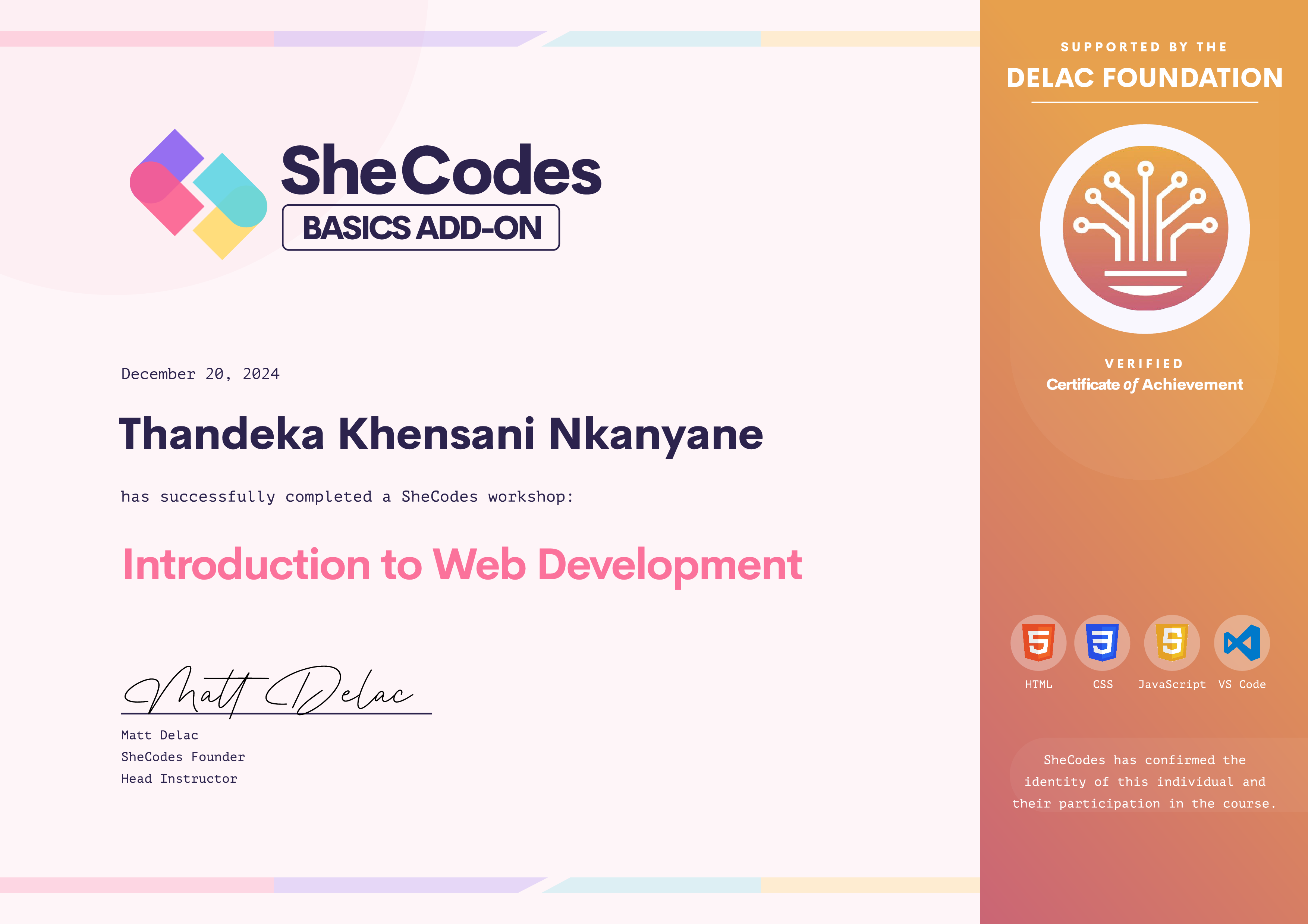 Thandeka Khensani has been fully supported by the Delac Foundation to complete this SheCodes Workshop