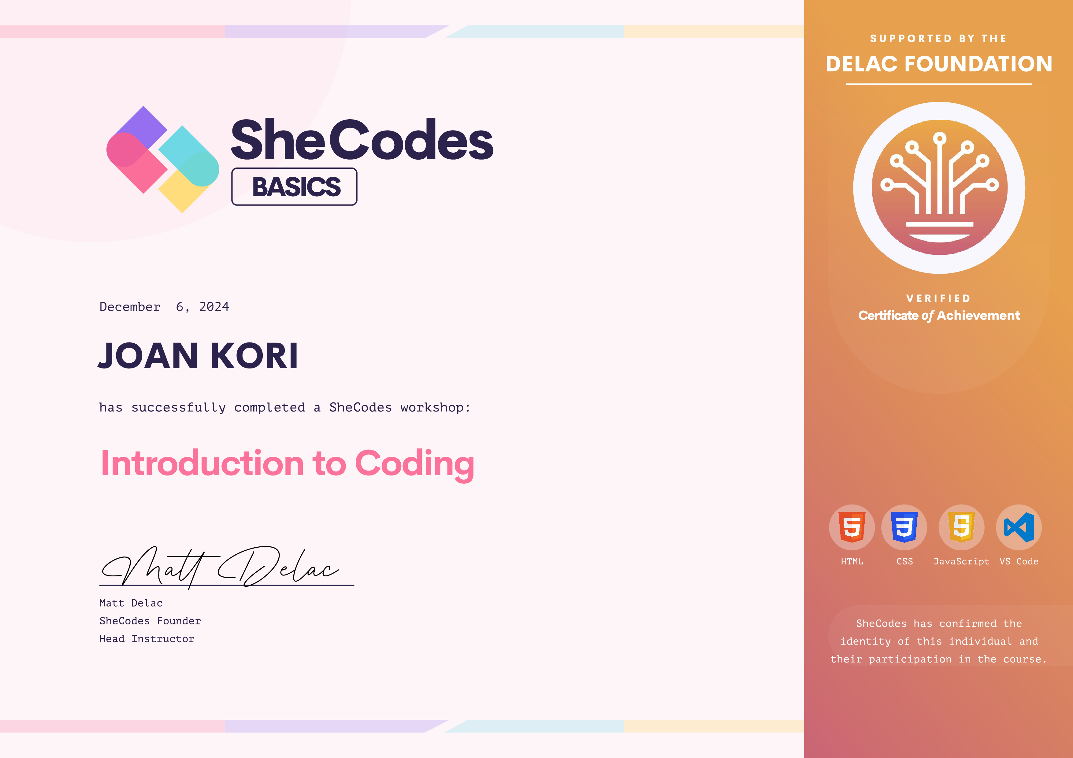 JOAN successfully graduated from at least one SheCodes Coding Workshop and is featured in the SheCodes Hall of Fame