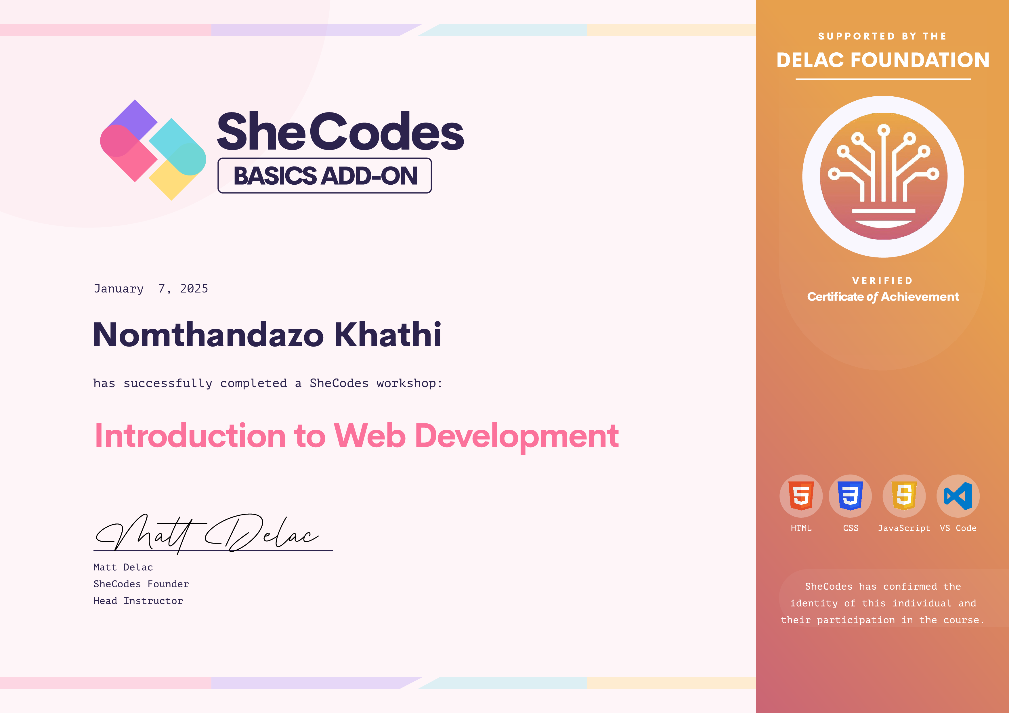 Nomthandazo has been fully supported by the Delac Foundation to complete this SheCodes Workshop