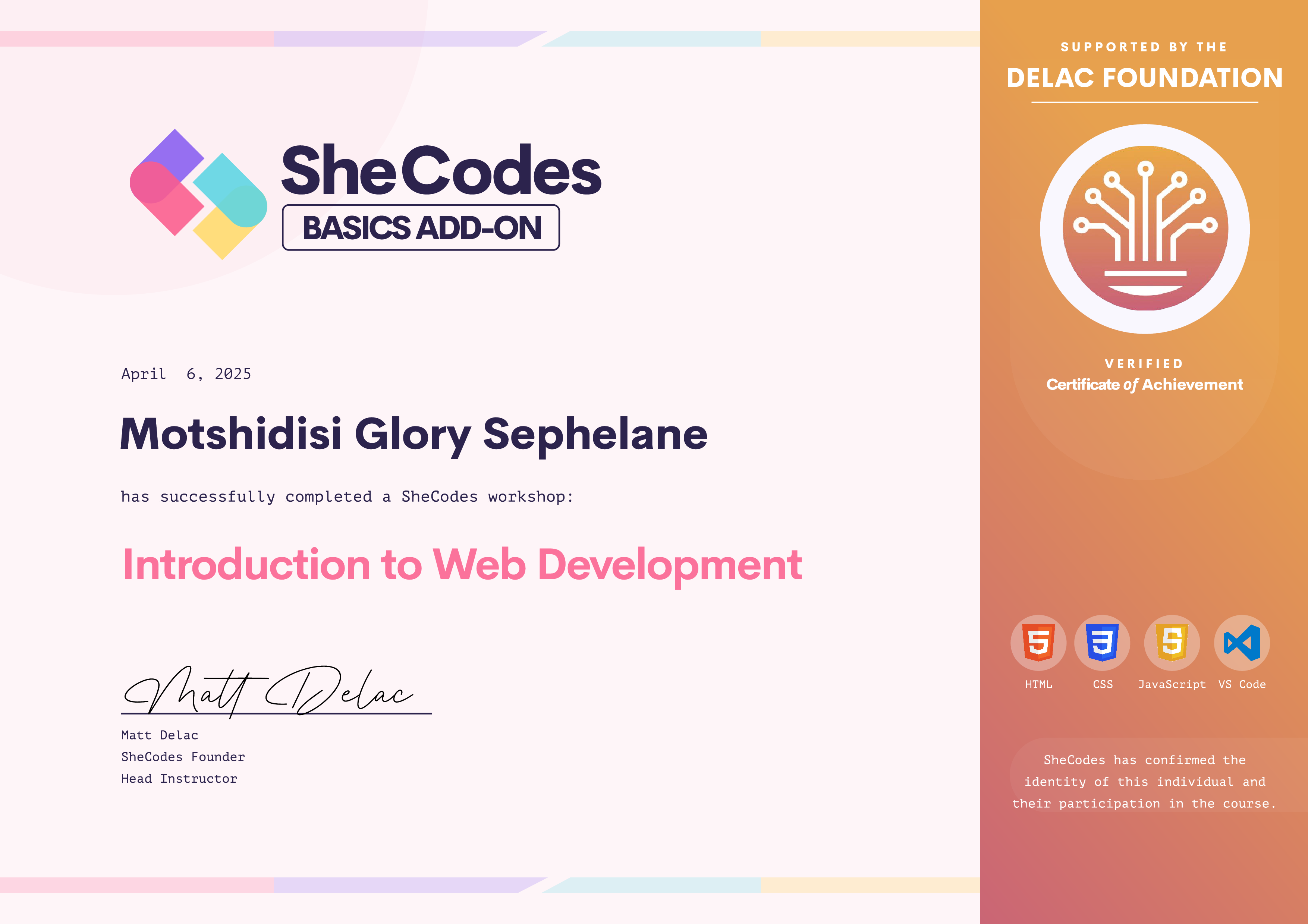 Motshidisi Glory has been fully supported by the Delac Foundation to complete this SheCodes Workshop