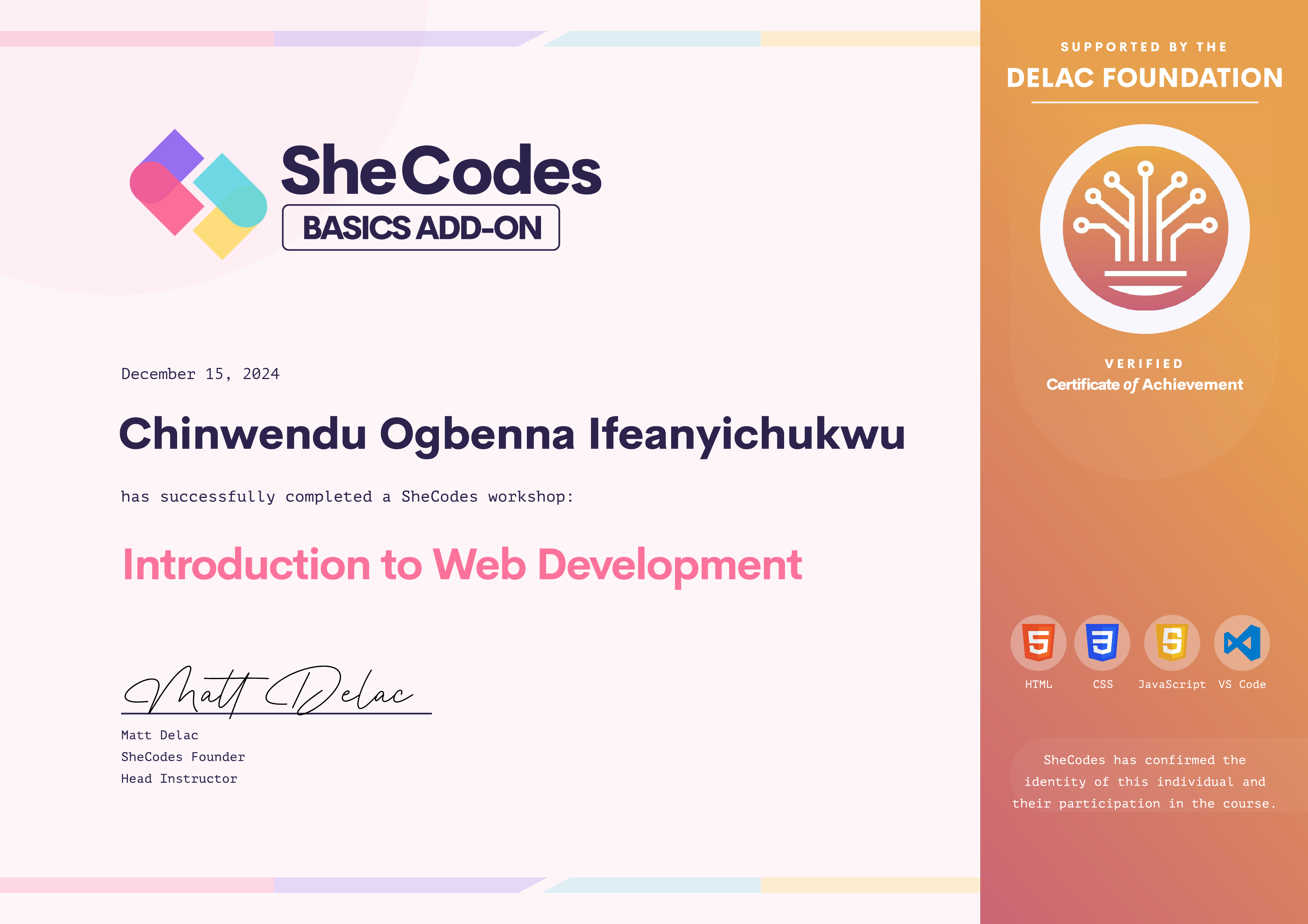Chinwendu has been fully supported by the Delac Foundation to complete this SheCodes Workshop
