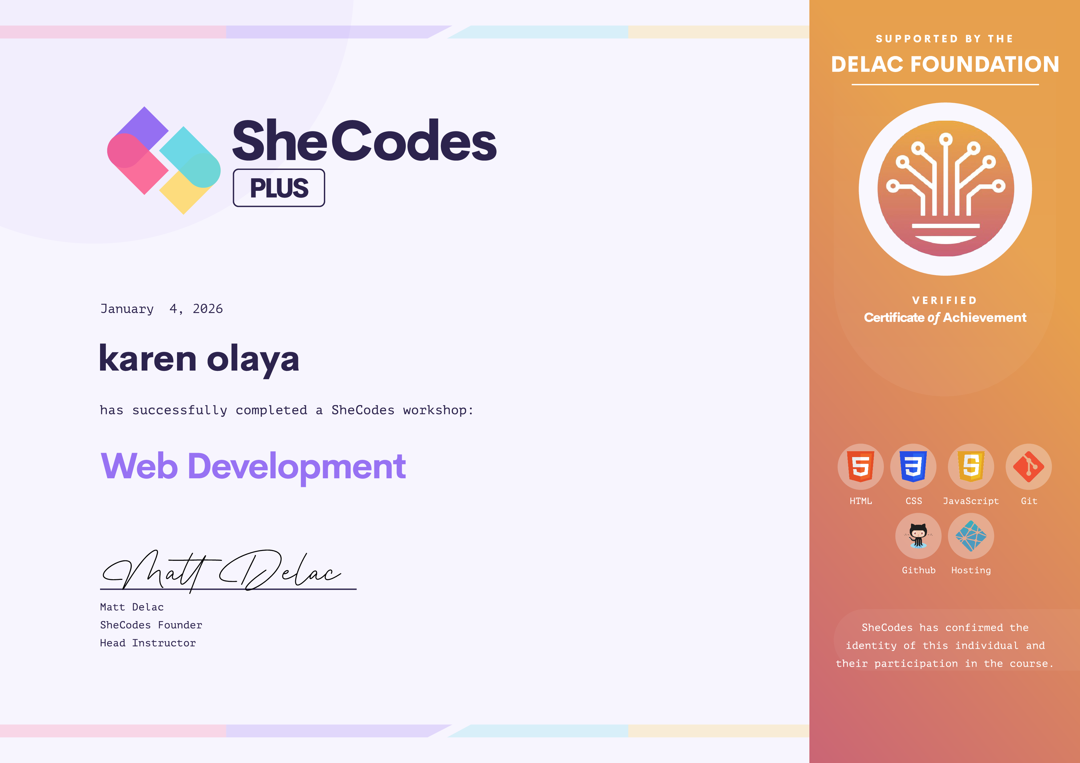 karen has been fully supported by the Delac Foundation to complete this SheCodes Workshop