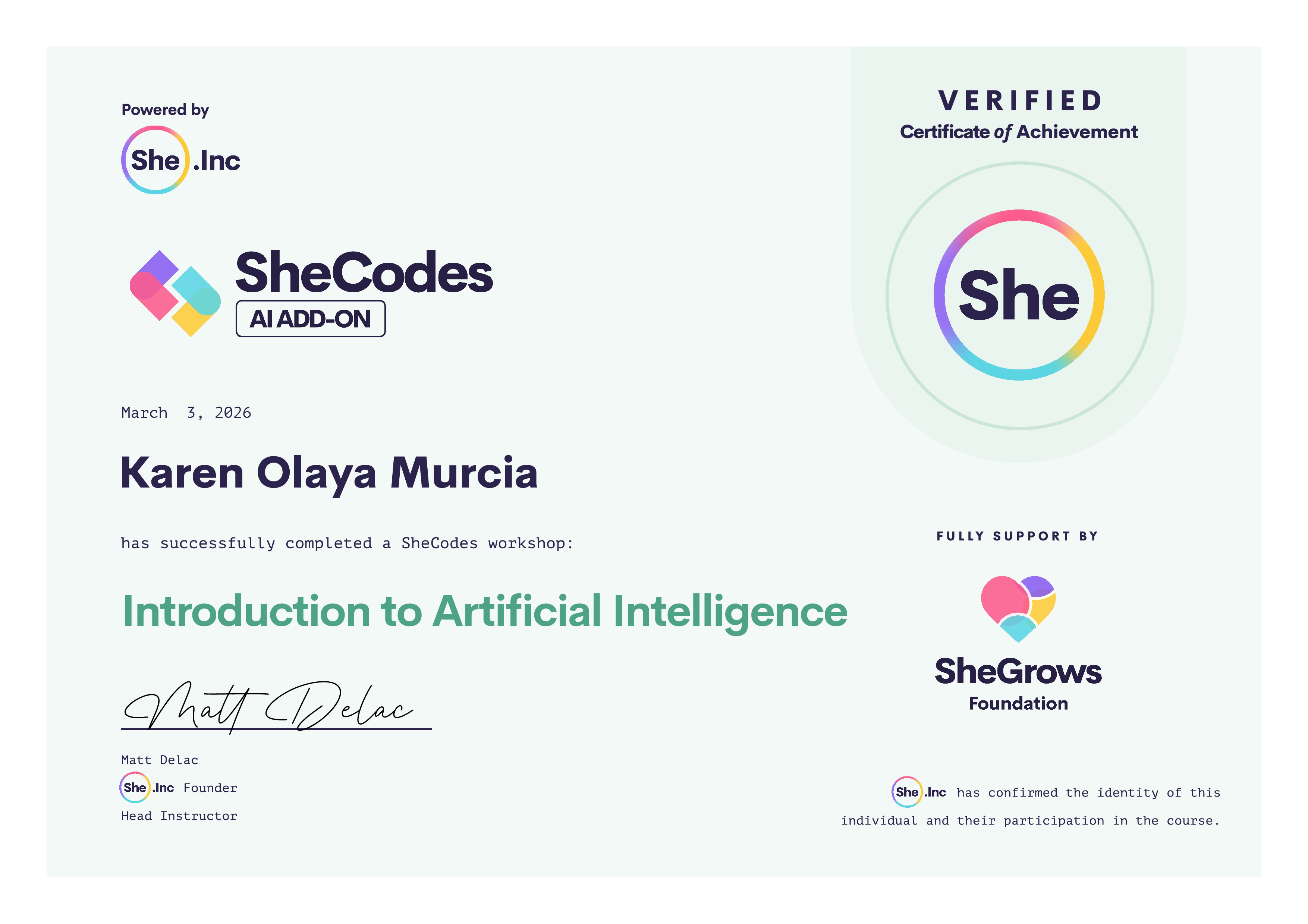 Karen has been fully supported by the The SheGrows Foundation to complete this SheCodes Workshop
