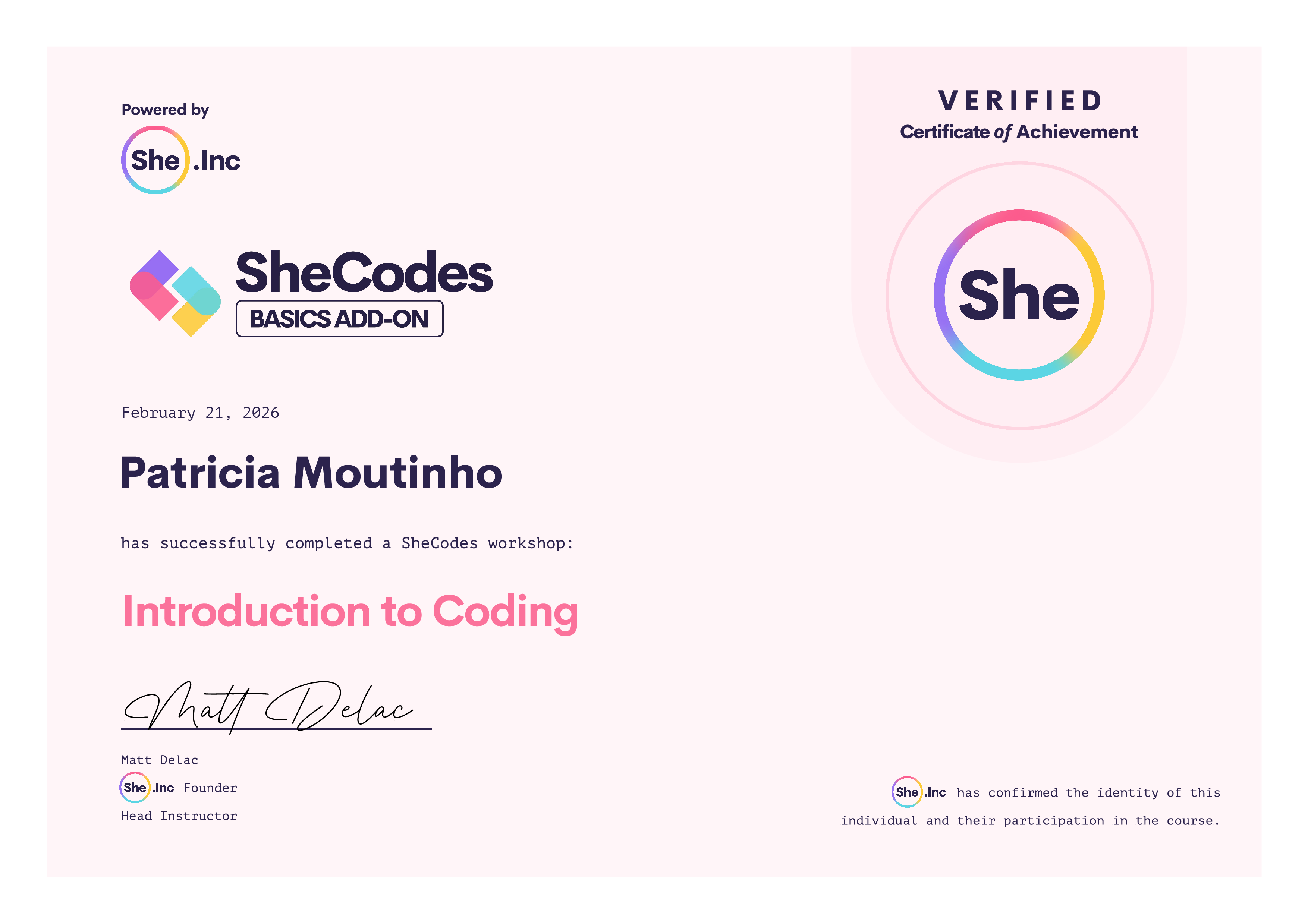 “highly recommend the SheCodes Basic Add-On to anyone who wants to go beyond the fundamentals and truly strengthen their coding skills. The lessons are clear, practical, and incredibly well-structured, making it easy to build confidence step by step.
