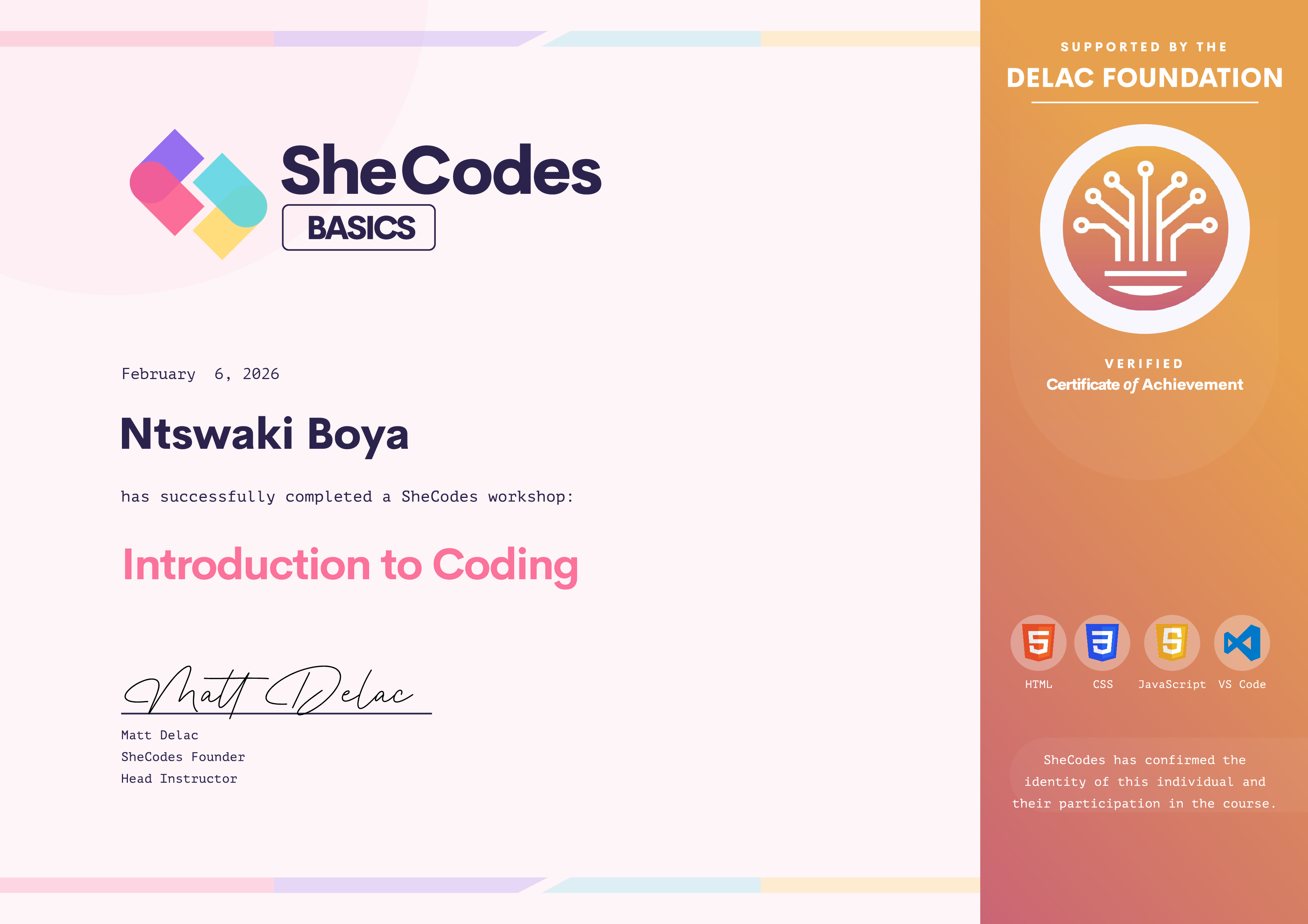 Ntswaki has been fully supported by the The Delac Foundation to complete this SheCodes Workshop