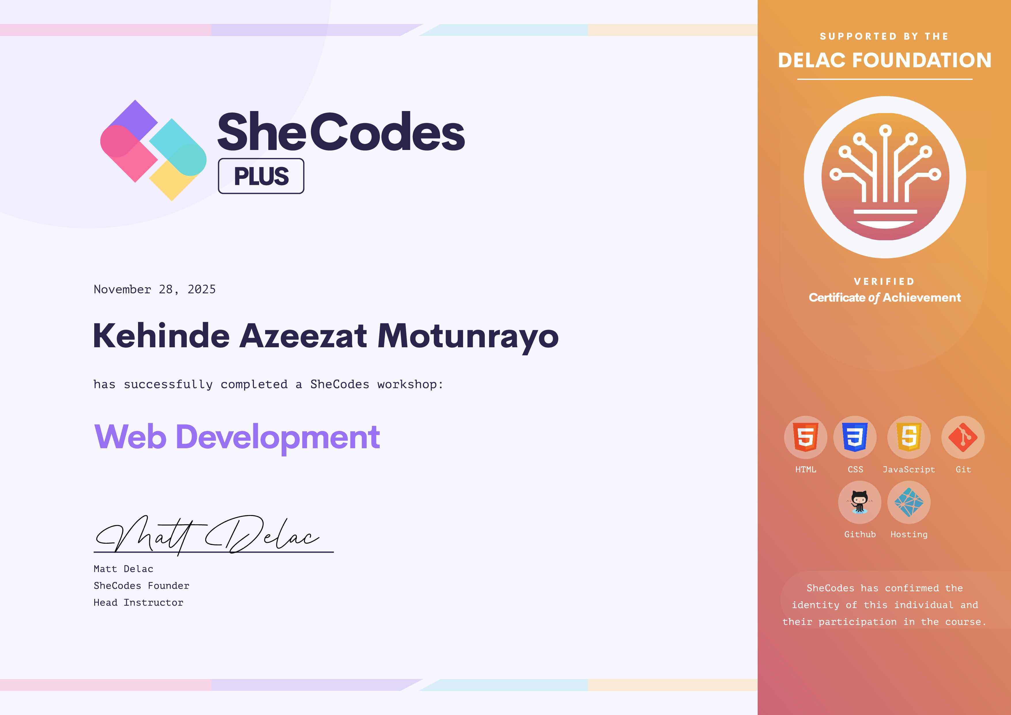 Kehinde has been fully supported by the Delac Foundation to complete this SheCodes Workshop