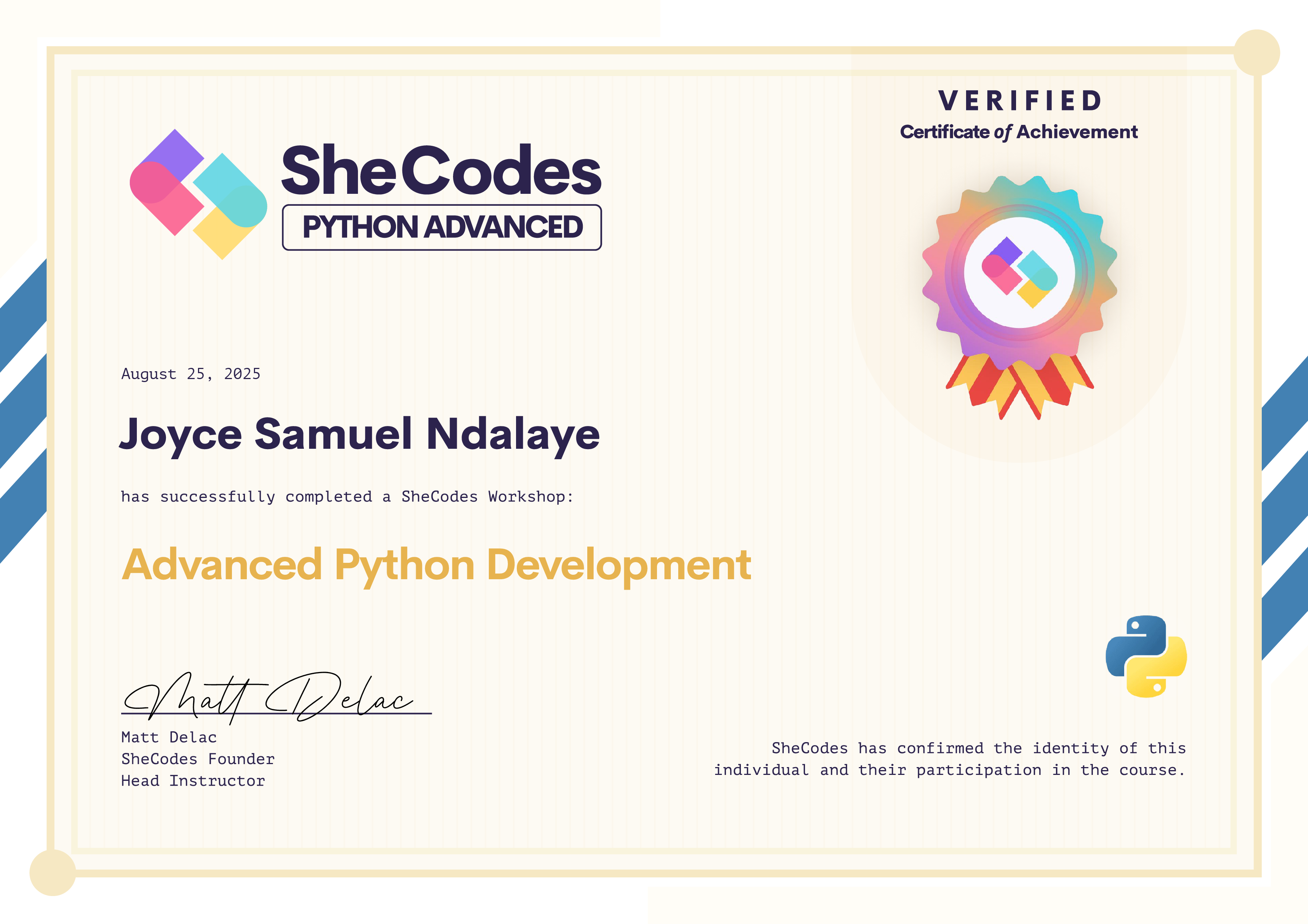 Joyce Samuel successfully graduated from at least one SheCodes Coding Workshop and is featured in the SheCodes Hall of Fame