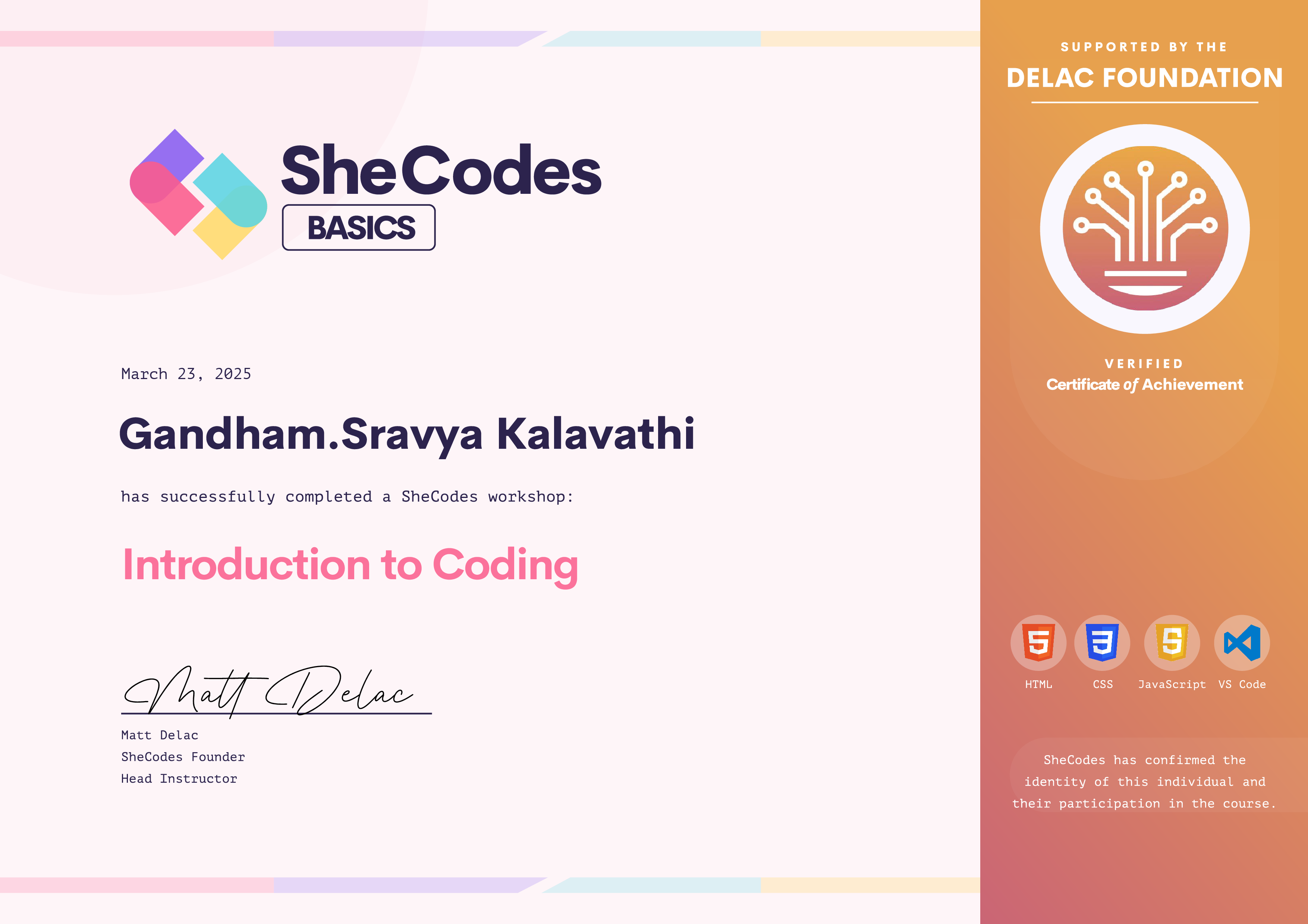 Gandham.Sravya has been fully supported by the Delac Foundation to complete this SheCodes Workshop
