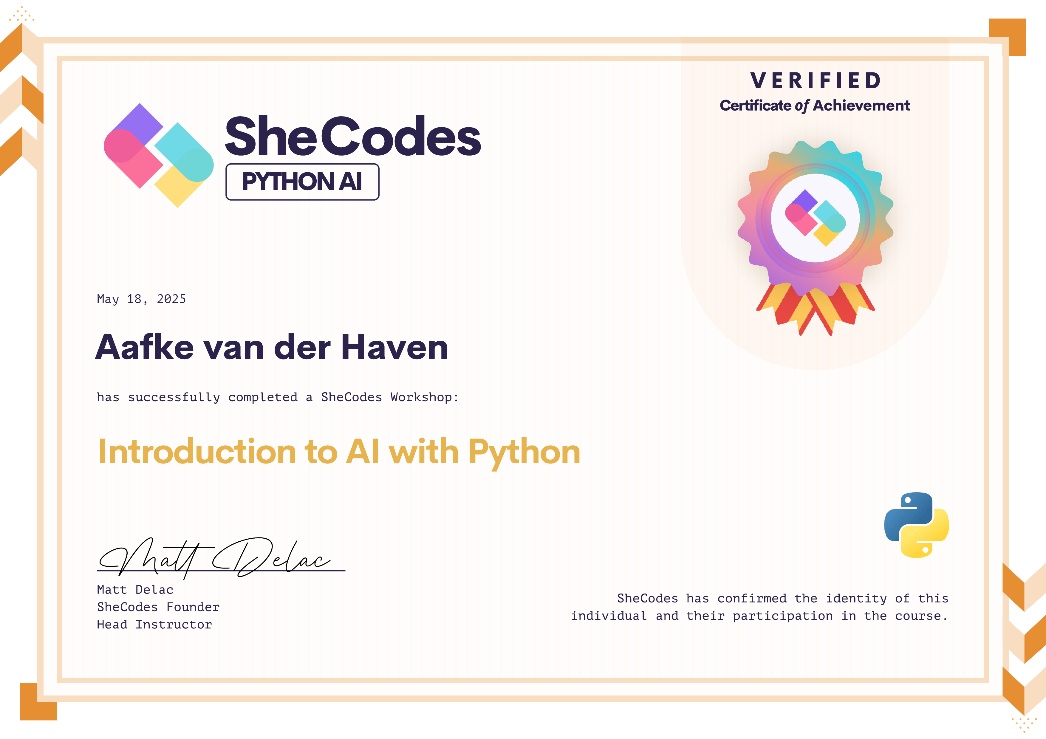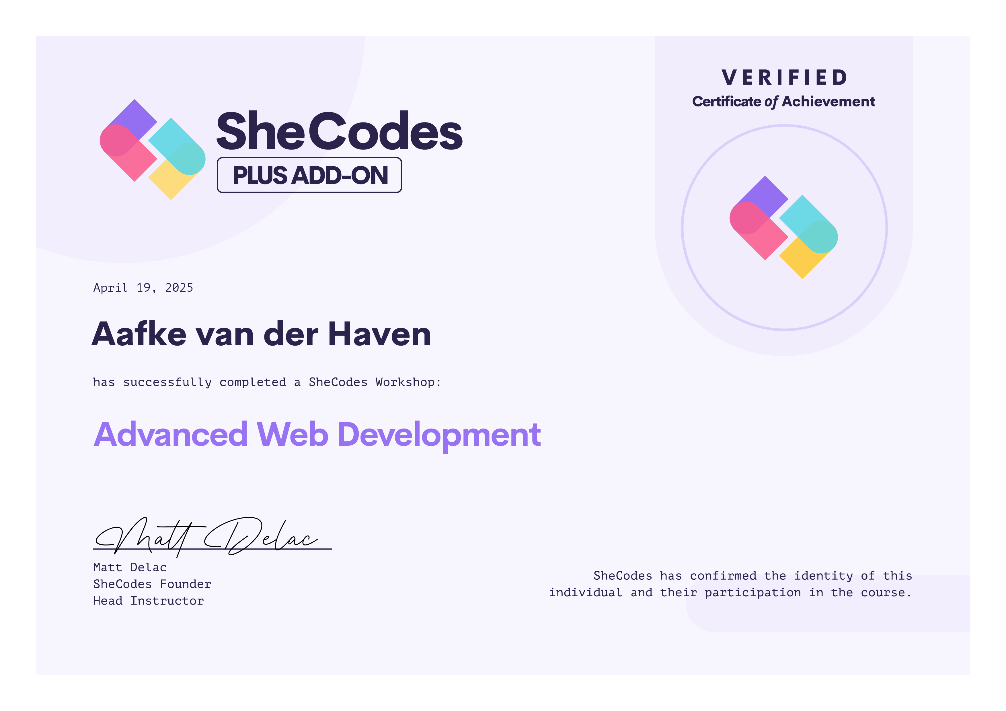 Aafke successfully graduated from at least one SheCodes Coding Workshop and is featured in the SheCodes Hall of Fame