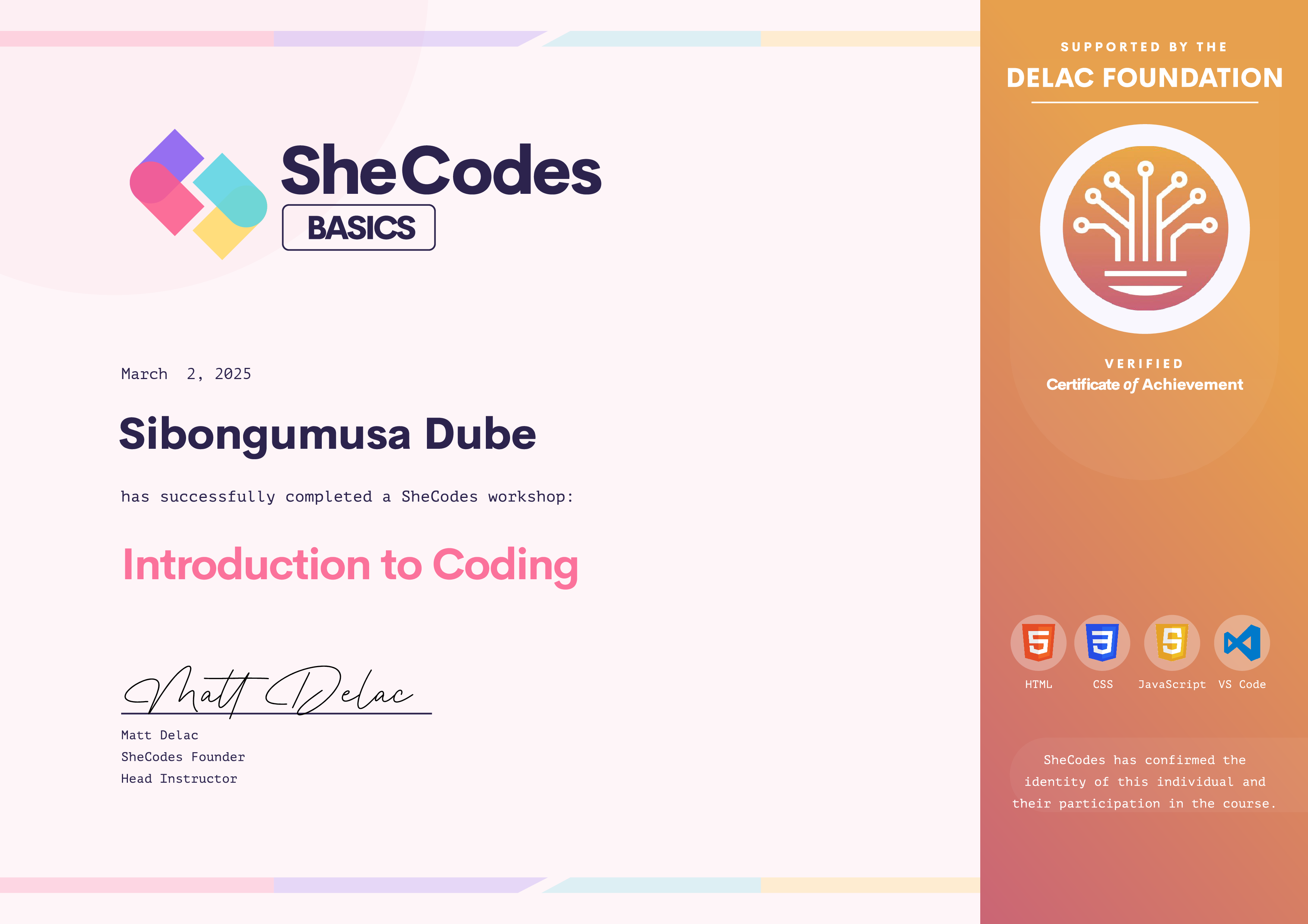 Sibongumusa has been fully supported by the Delac Foundation to complete this SheCodes Workshop