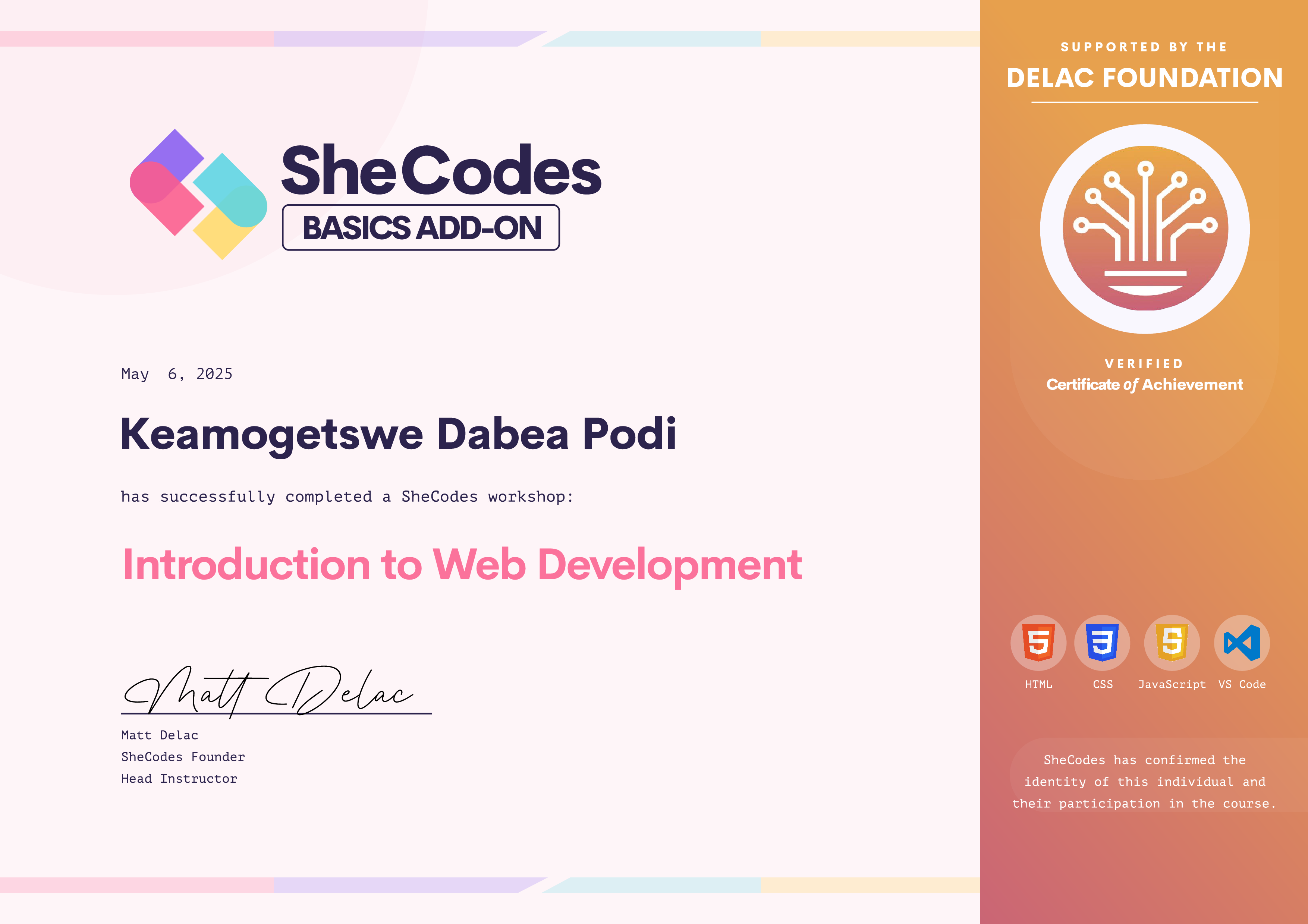 Keamogetswe Dabea has been fully supported by the Delac Foundation to complete this SheCodes Workshop