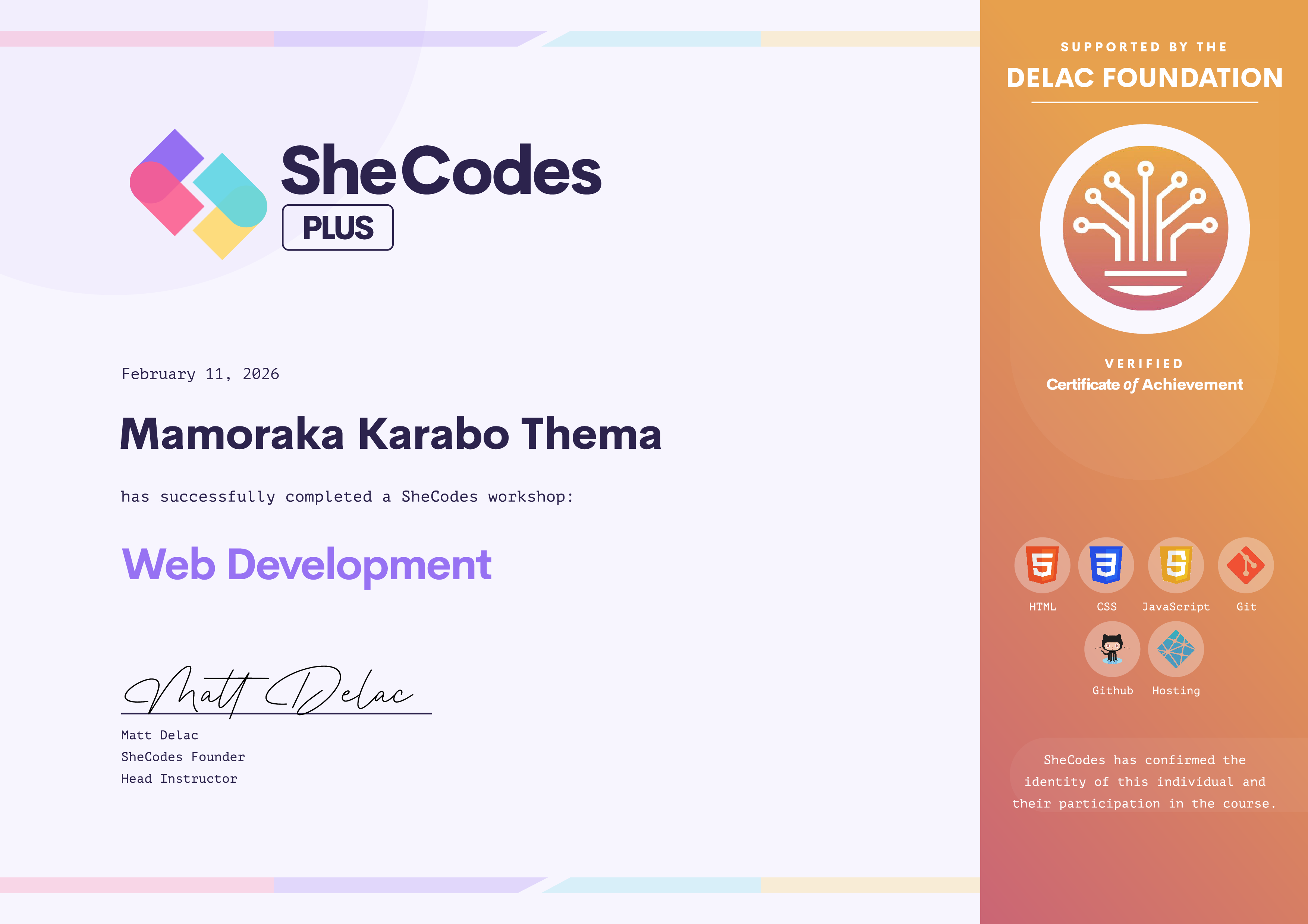Mamoraka Karabo has been fully supported by the The Delac Foundation to complete this SheCodes Workshop